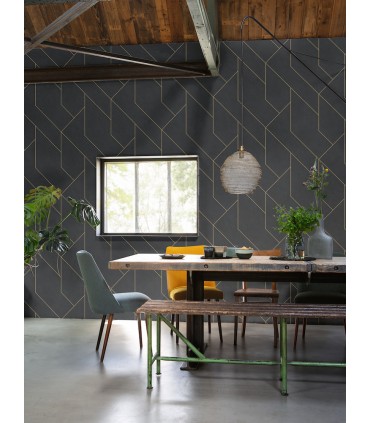 Add a hint of subtle glamour to your space with this bold geometric wallpaper! The matte black shapes are outlined in glittery gold for a dramatic contemporary look. Pollock is an unpasted, vinyl on non woven wallpaper.
