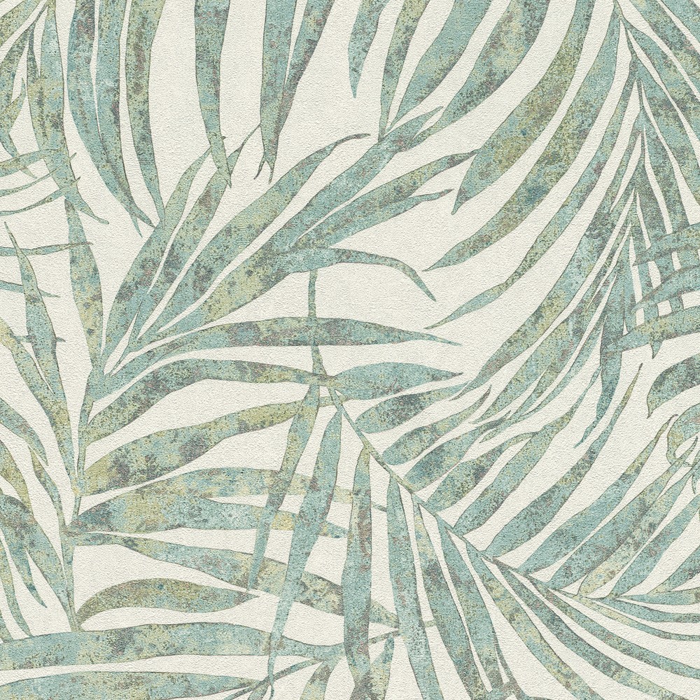 Bring earthen elegance to your interiors with this colorful frond design. Each palm leaf is inked with a fusion of teal and green hues against an off-white backdrop, raised inks creating stucco-like texture throughout the design. Anzu is an unpasted, vinyl on non woven wallpaper.