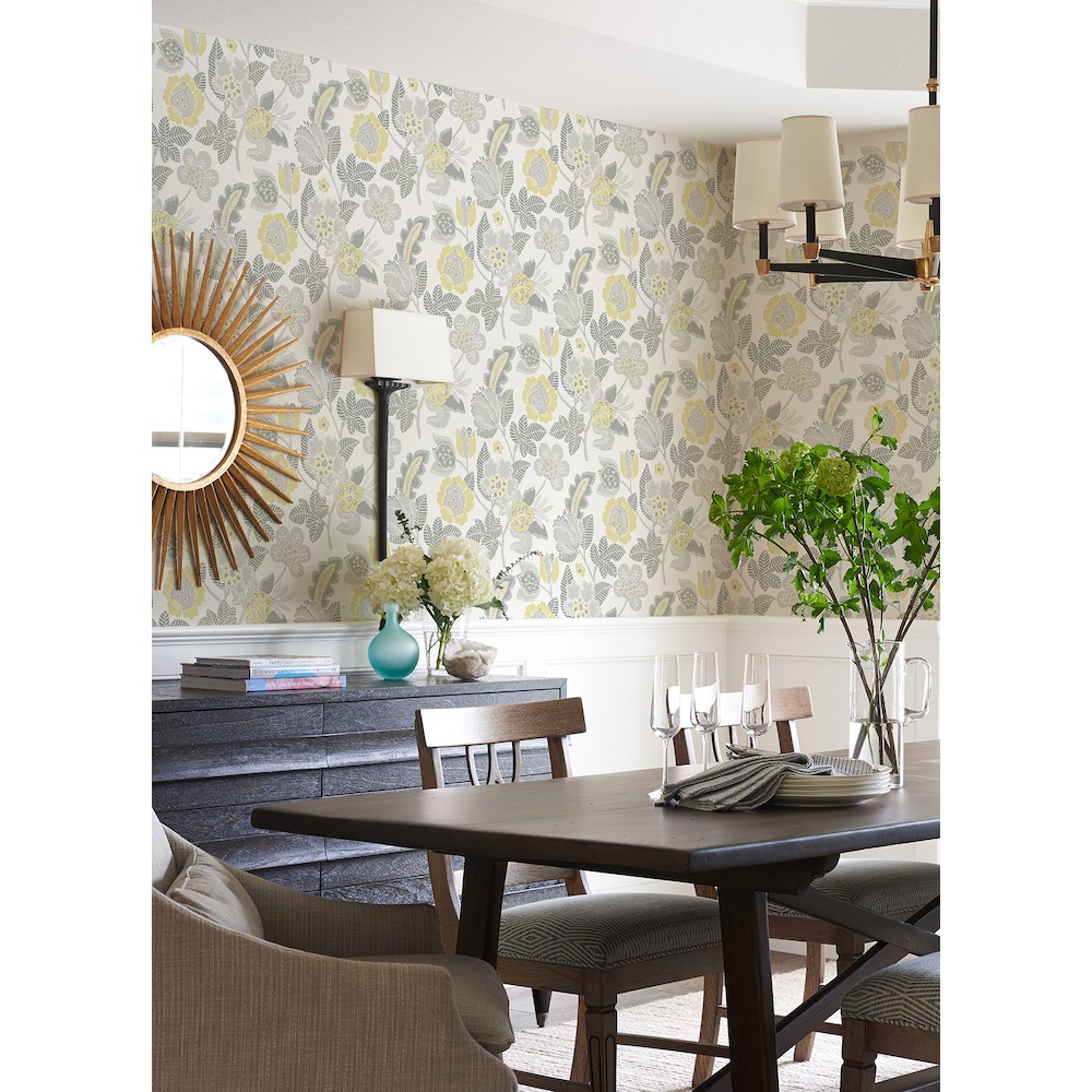 The classic sophistication of Jacobean florals has been updated in this chic wallpaper. The floral trails are inked in shades of light grey and soft yellow, the shapes embellished with white detailing that matches the backdrop. Jana is an unpasted, non woven wallpaper.