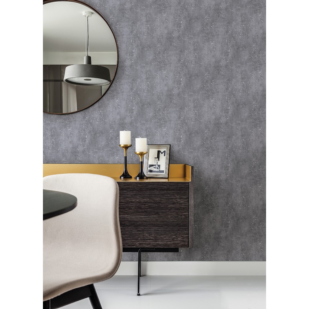 Enjoy an abstract and organic texture with this cork wallpaper. The design features a cool grey palette accented by splotches of muted silver. Miller is an unpasted, vinyl on non woven wallpaper.