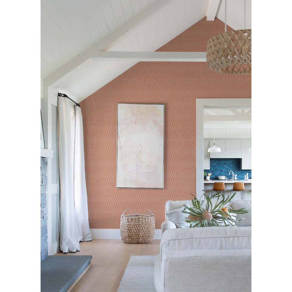 This wavy wallpaper is the perfect fusion of chic, simple, and retro! The waving, painted coral lines form tight peaks and valleys along a salmon-pink backdrop. Lars is an unpasted, non woven wallpaper.