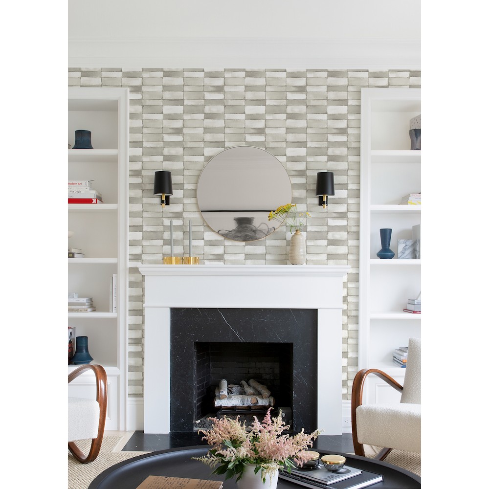 A modern and more glamorous take on subway tile, this wallpaper brings both style and convenience! The checkerboard pattern alternates between silver-grey and pearlescent white. Braden is an unpasted, non woven wallpaper.