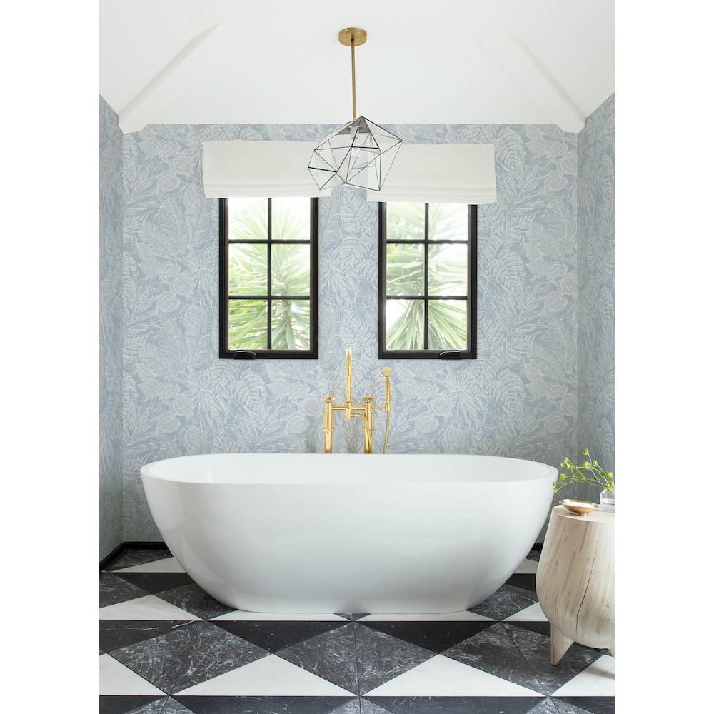 This serene tropical wallpaper offers timeless sophistication. A medley of lush palm leaves are outlined in white against a soft blue backdrop with rich, paper weave texture. Brentwood is an unpasted, paper weave grasscloth wallpaper measuring 27 inches wide by 27 feet long, covering approxiamately About 60.8 square feet square feet per roll