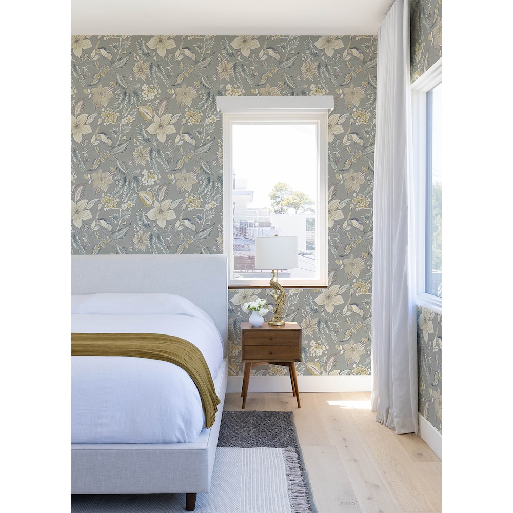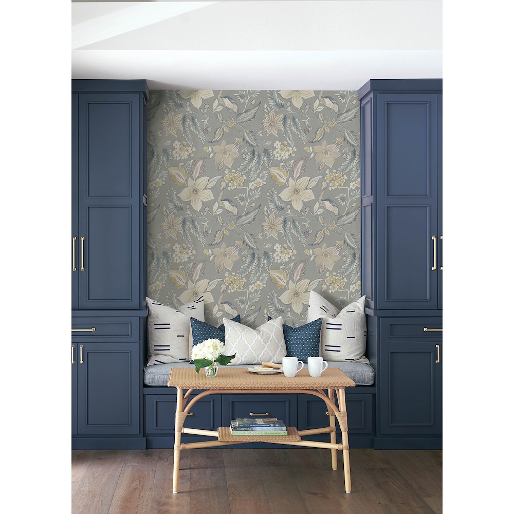 This floral wallpaper is rich in feminine charm and chinoiserie flair. The winding vines dotted with voluminous flowers and visiting cranes is painted in a variety of blue, taupe, mustard, lavender, and grey watercolor hues. Crestwood is an unpasted, non woven wallpaper measuring 20.5 inches wide by 33 feet long, covering approxiamately About 56.4 square feet square feet per roll