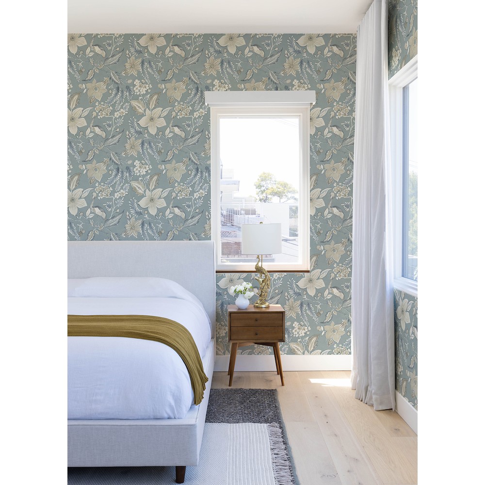 This floral trail wallpaper offers a modern take on chinoiserie charm. The painterly design features lush floral vines visited by crowned cranes, all detailed in shades of white, grey, and blue. Crestwood is an unpasted, non woven wallpaper measuring 20.5 inches wide by 33 feet long, covering approxiamately About 56.4 square feet square feet per roll