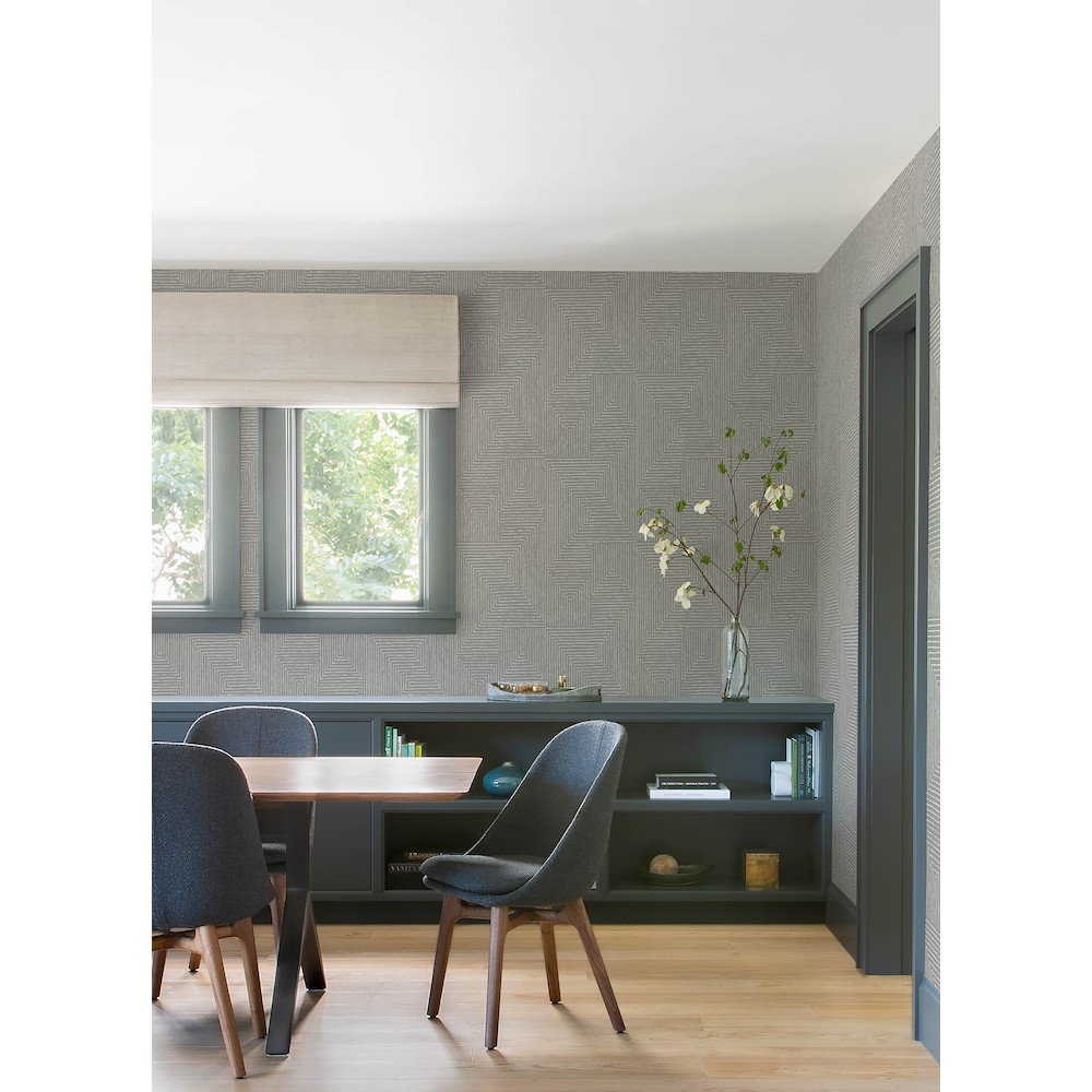 Soft and compelling, this geometric wallpaper brings organic dimension to your interiors. The maze-like pattern is painted in white along a cool grey cork background. Mortenson is an unpasted, cork wallpaper measuring 27 inches wide by 27 feet long, covering approxiamately About 60.8 square feet per roll