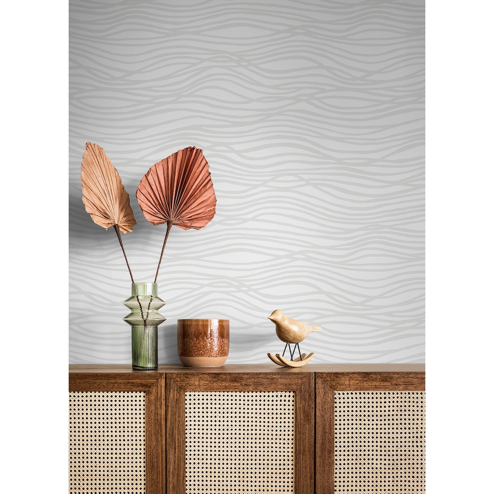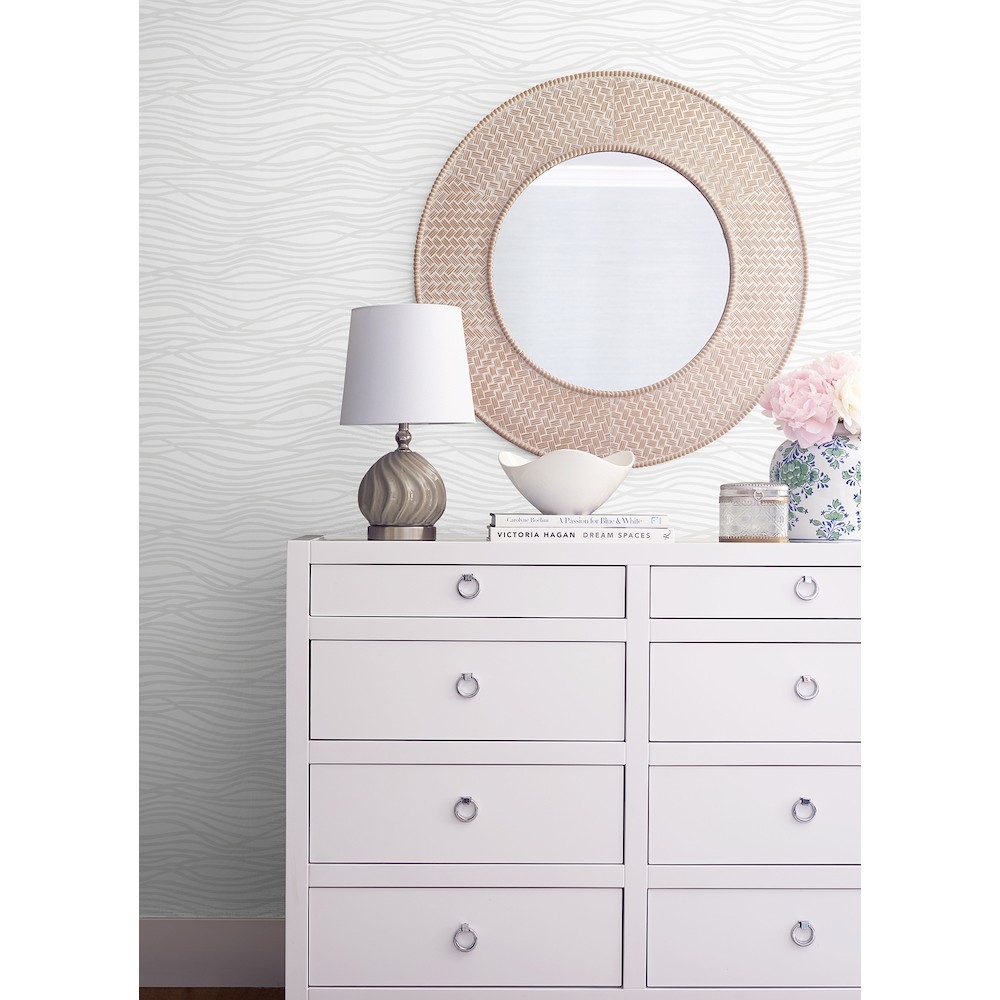 Modern and luxurious, this abstract design adds a hint of glamour to your interiors. Strands of flashing, beaded silver stripes slowly ripple across a crisp white backdrop. Galyn is an unpasted, non woven wallpaper.
