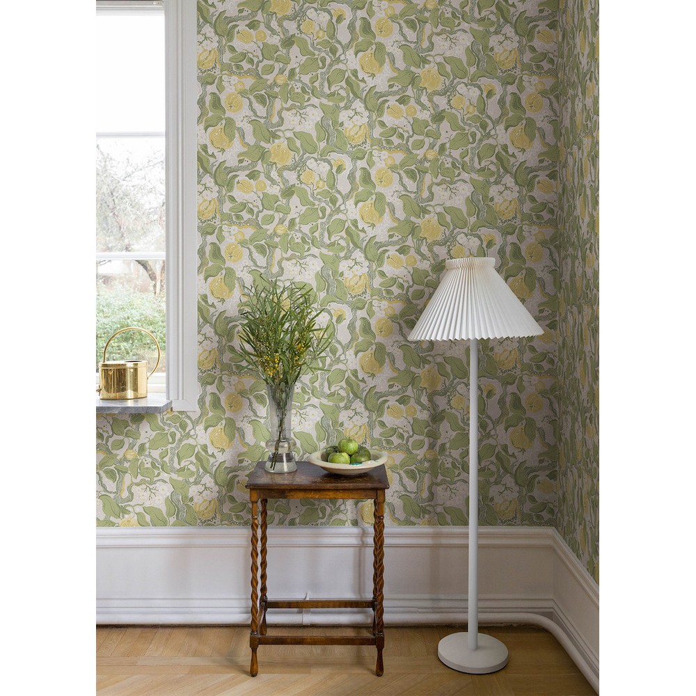 Celebrate the rich bounty of summertime with this charming botanical wallpaper. The illustrative design features interwoven vines heavy with ripe fruit and delicate floral blooms, inked in shades of sage green, golden yellow, and white against light grey. Kort is an unpasted, non woven wallpaper measuring 20.9 inches wide by 33 feet long, covering approxiamately About 57.5 square feet square feet per roll