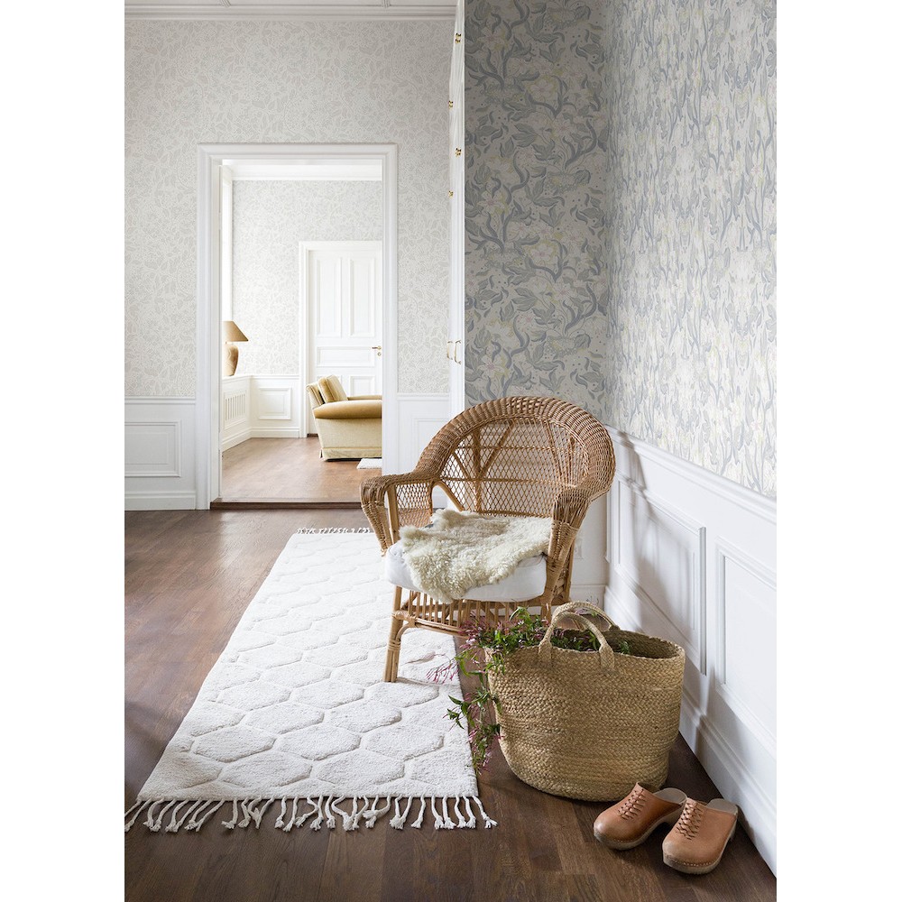 Enjoy soft, feminine sophistication with this modern take on damask design. The illustrative florals feature a soothing palette of light grey, pale chartreuse, pink, and blue against a cream backdrop. Lisa is an unpasted, non woven wallpaper measuring 20.9 inches wide by 33 feet long, covering approxiamately About 57.5 square feet square feet per roll