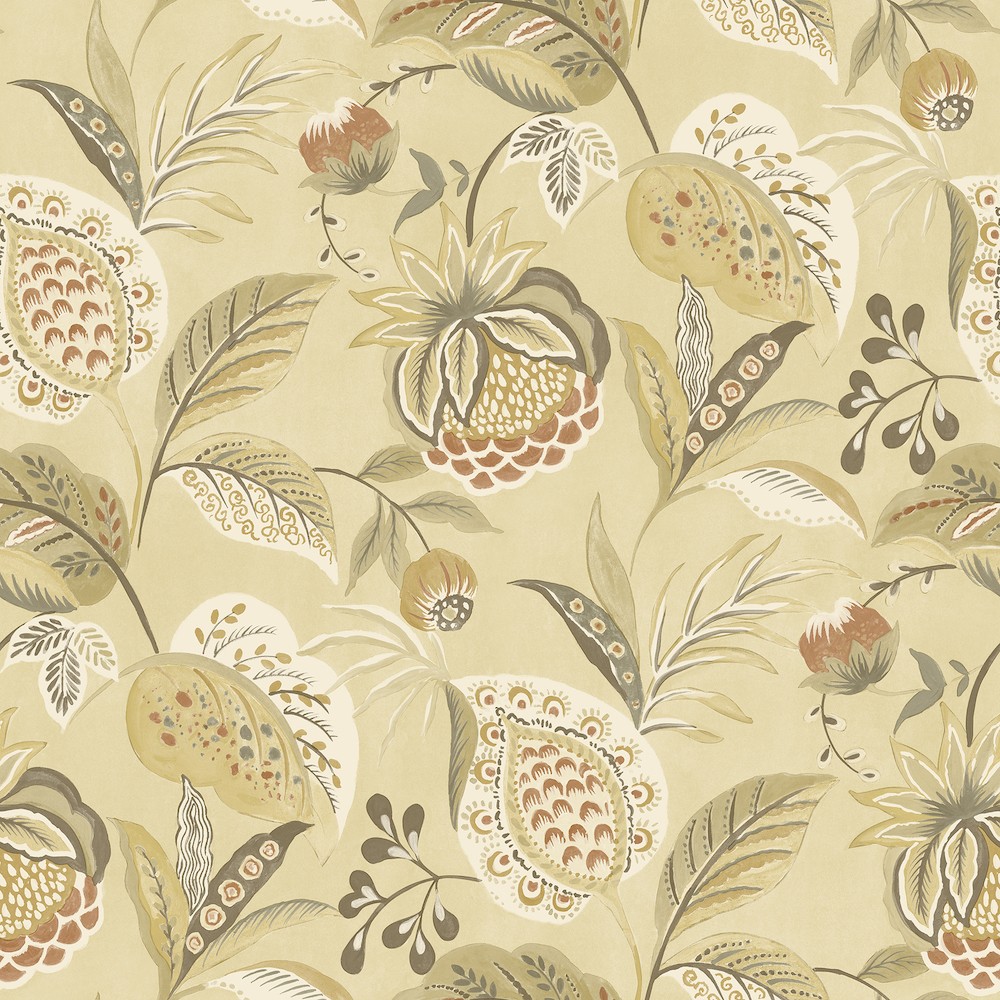 Bohemian Jacobean's inviting and painterly take on the classic pattern features a warm palette of yellows, light brown, terracotta, and cream. Bohemian is a prepasted, sure strip wallpaper measuring 20.5 inches wide by 33 feet long, covering approximatelyAbout 56.4 square feet per roll