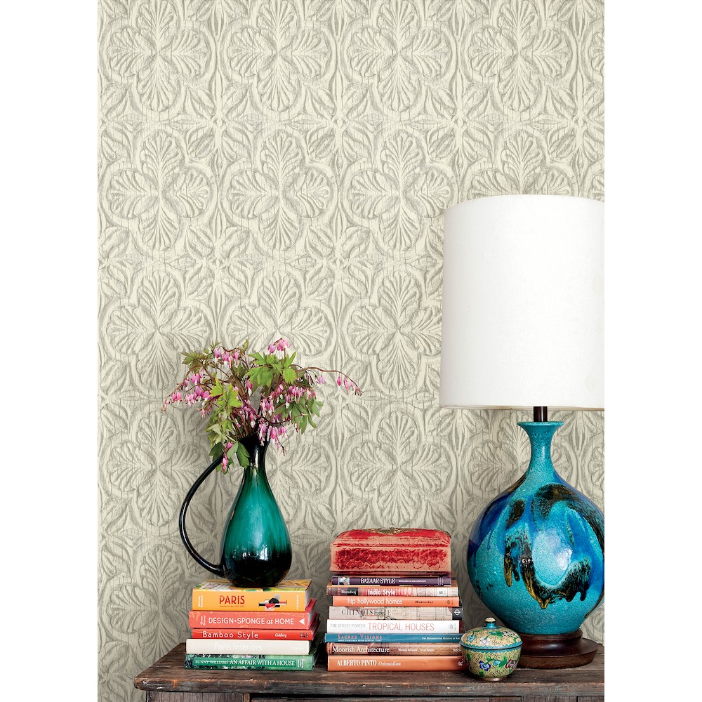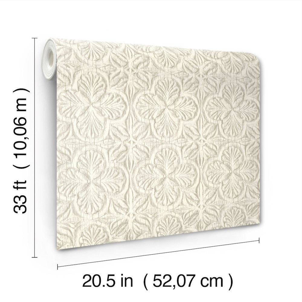 This carved damask design was inspired by an antique door, grey detailing adding richness to the wooden pattern. Karachi is a prepasted, sure strip wallpaper measuring 20.5 inches wide by 33 feet long, covering approximatelyAbout 56.4 square feet per roll