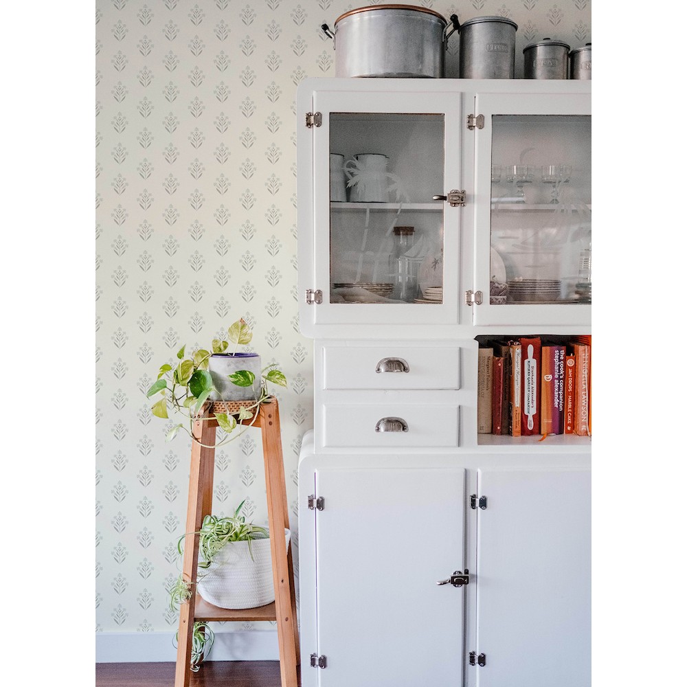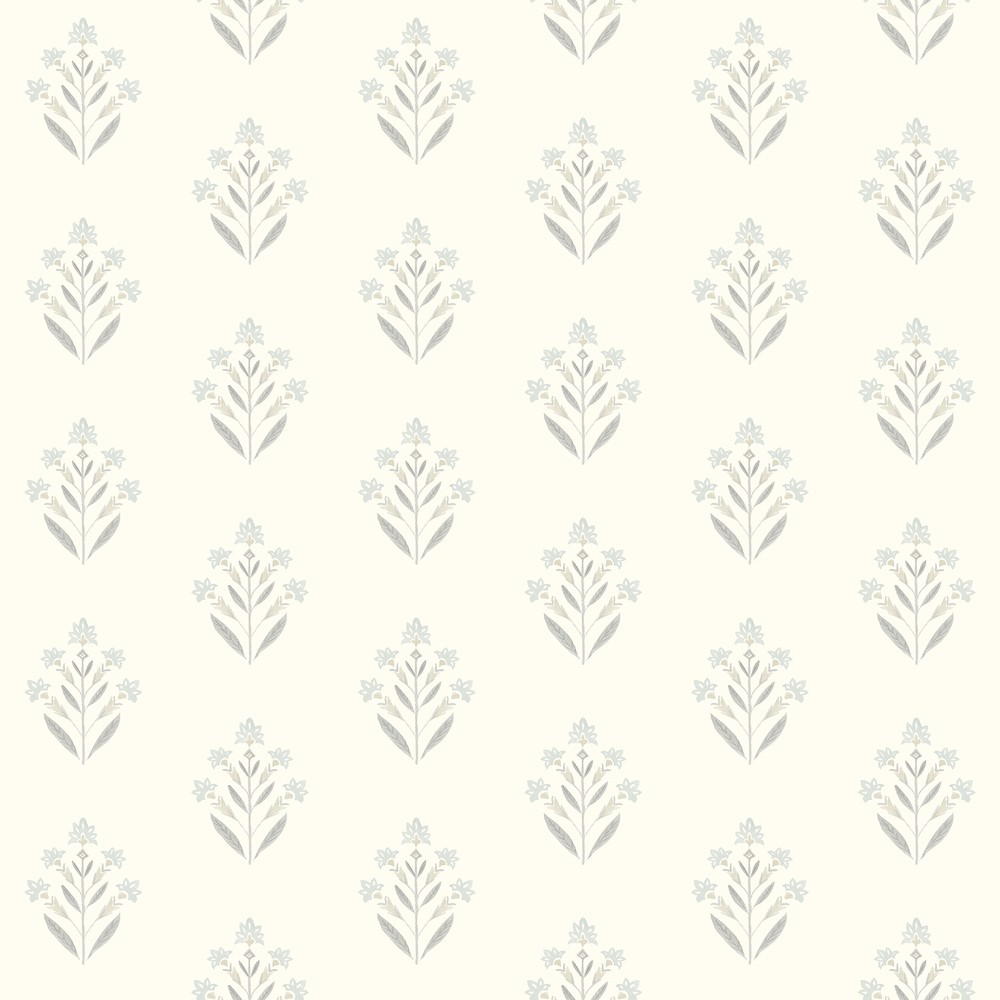 This delicate floral design, featuring a leafy grey stem with five dainty blue flowers, is a timeless option for feminine elegance. Kova is a prepasted, sure strip wallpaper measuring 20.5 inches wide by 33 feet long, covering approximatelyAbout 56.4 square feet per roll