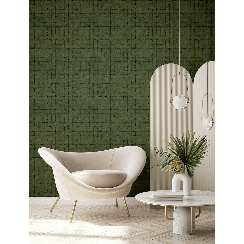 This wallpaper offers a perfect marriage of texture and geometric detailing. An organic grid of squares is created with webbed olive embossing along a dark green backdrop. Blocks is an unpasted, non woven wallpaper measuring 20.5 inches wide by 33 feet long, covering approximately 56.4 square feet per roll.