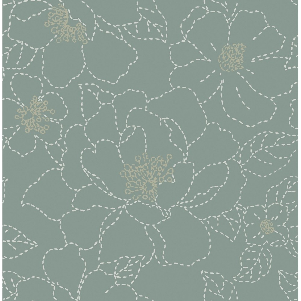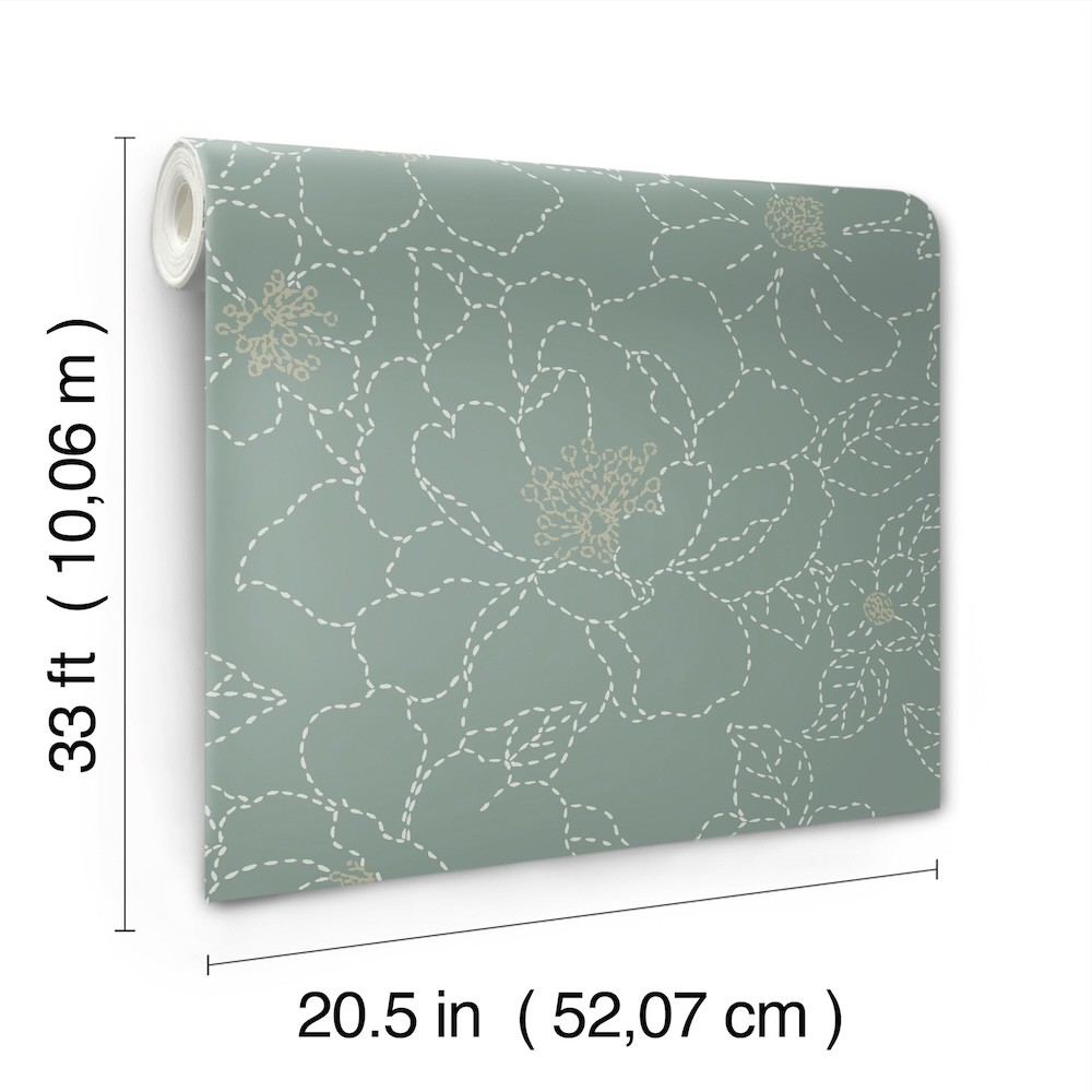 Add simple, feminine charm to your interiors with this floral design. The blossoms are outlined in white stitching against a pale, blue-green backdrop, the centers of the flowers embellished with metallic gold. Gardena is an unpasted, non woven wallpaper measuring 20.5 inches wide by 33 feet long, covering approximately 56.4 square feet per roll.