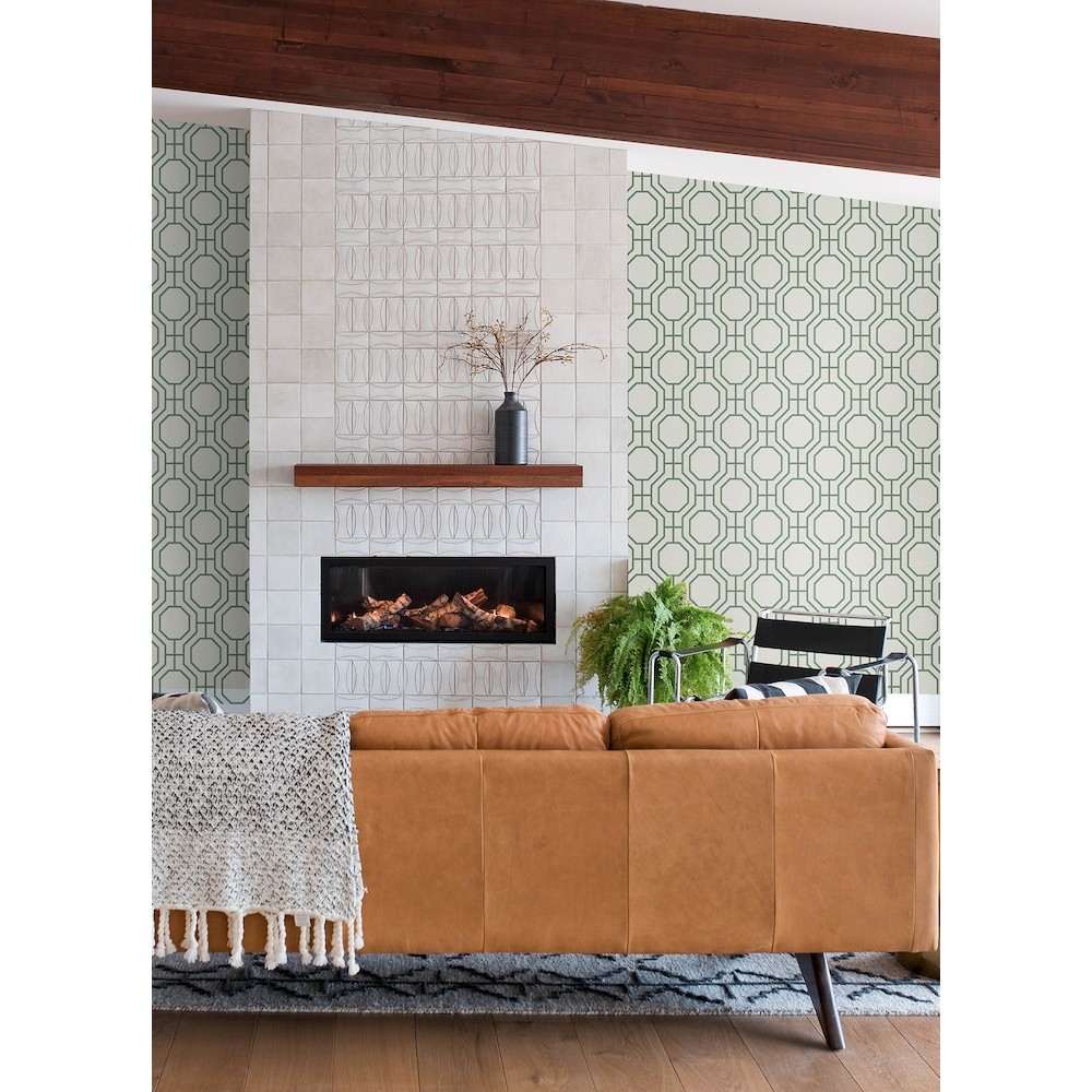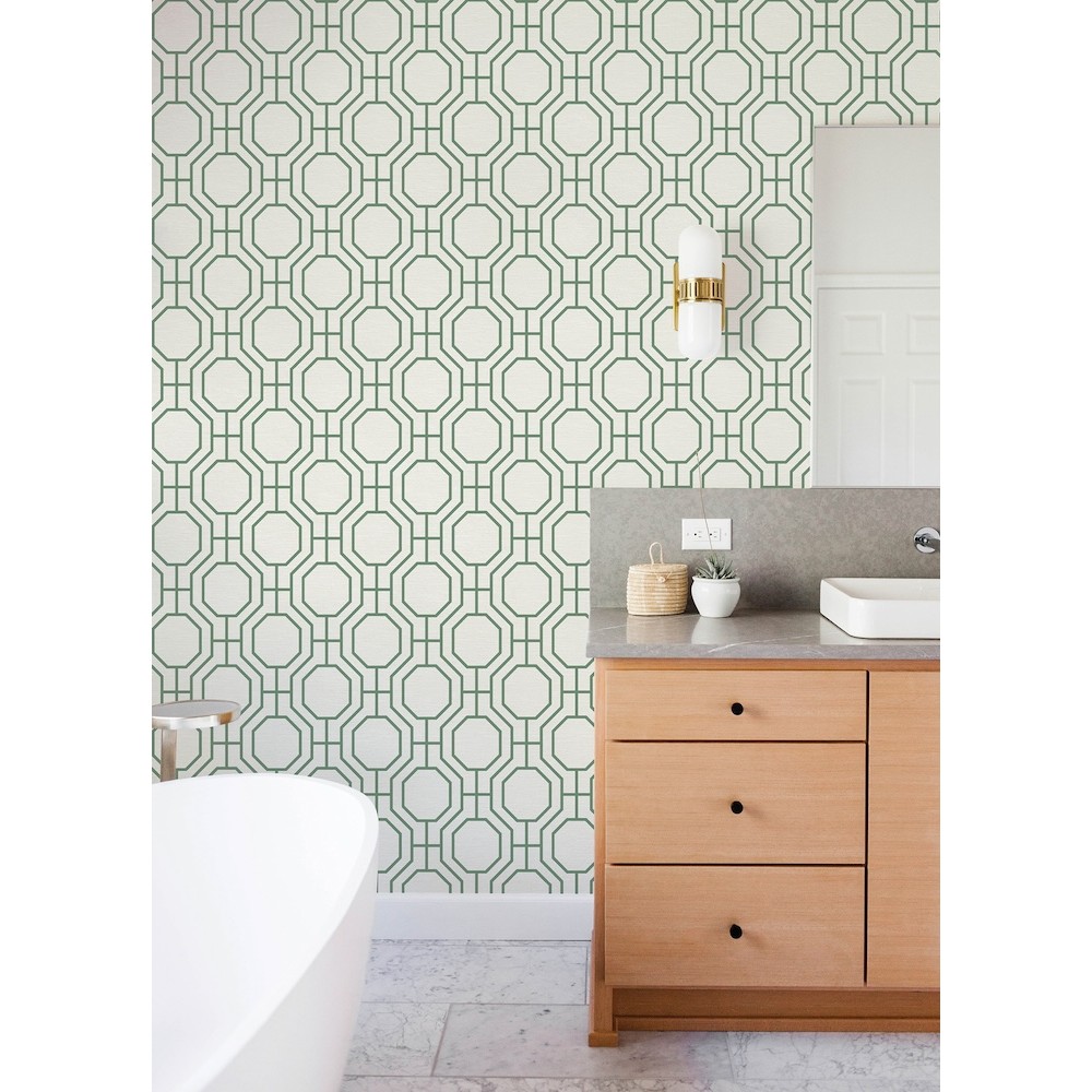 Enjoy a modern revitalization of trellis design with this wallpaper. The vibrant green gridwork features octagonal detailing, offset by a cream faux grasscloth background with tactile finishes. Manor is an unpasted, non woven wallpaper measuring 20.5 inches wide by 33 feet long, covering approximately 56.4 square feet per roll.
