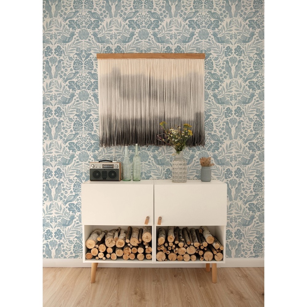 Bird lovers will flock to this whimsical damask wallpaper. A variety of tropical species are roosted amongst the flowers and rainforest flora, the details block printed in bright blue against white. Nestle is an unpasted, non woven wallpaper measuring 20.5 inches wide by 33 feet long, covering approximately 56.4 square feet per roll.