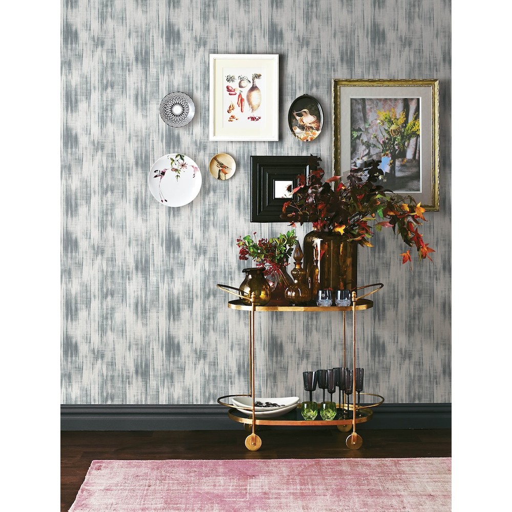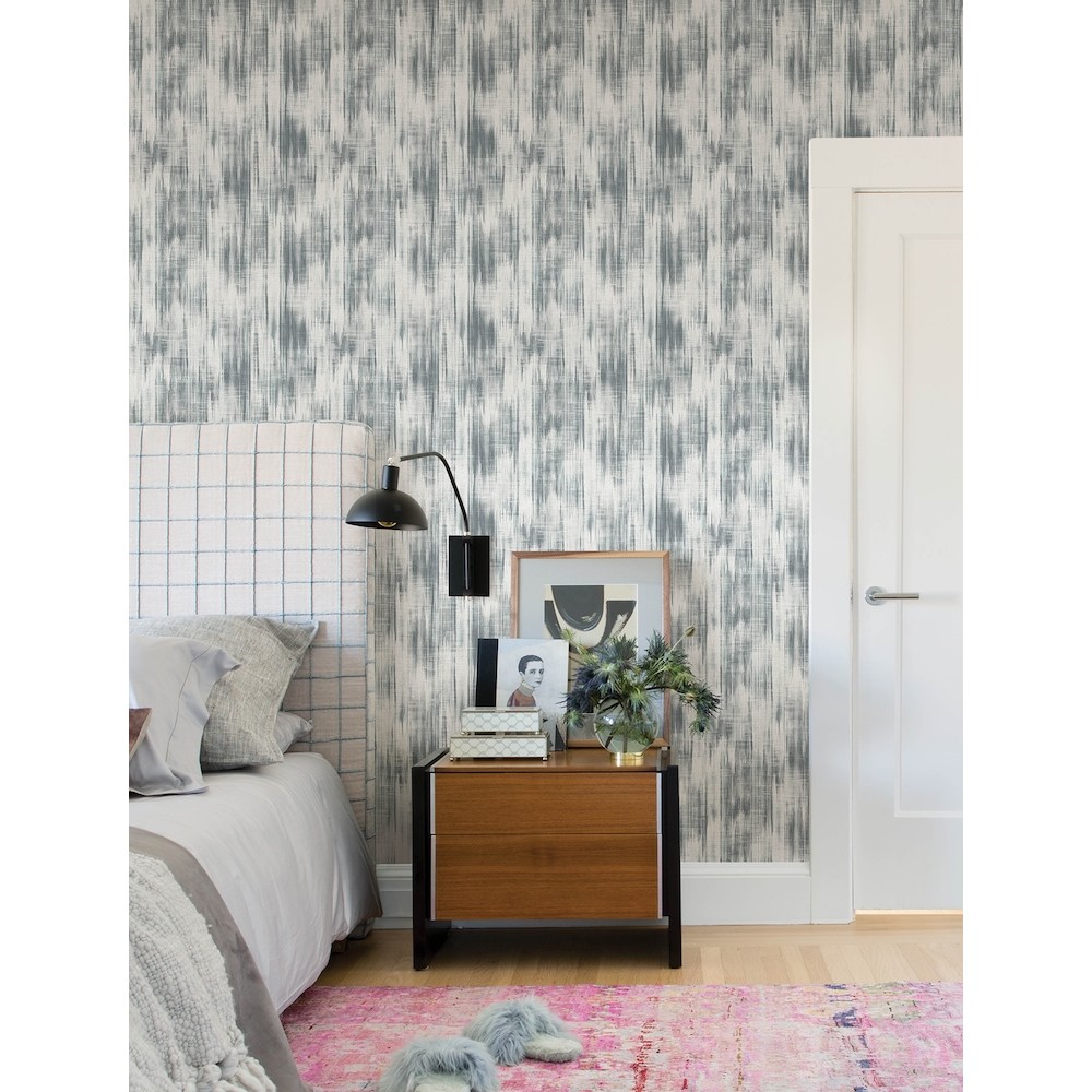 This artistic abstraction of shibori dye is given extra depth with textural detailing. The cool blues and greys drip haphazardly along a white backdrop, with vertical ribbing adding both a tactile element while enhancing its sense of movement. Marvel is an unpasted, non woven wallpaper measuring 20.5 inches wide by 33 feet long, covering approximately 56.4 square feet per rol