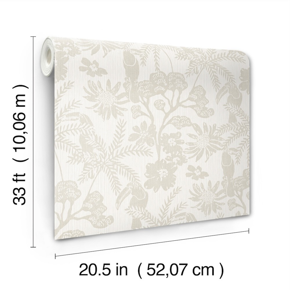 Enjoy a tropical take on classic trail wallpaper with this playful design. Toucans perch within the lush and winding rainforest flora, the details inked in warm taupe along a pale grey background with a ridged texture. Jacaranda is an unpasted, non woven wallpaper measuring 20.5 inches wide by 33 feet long, covering approximately 56.4 square feet per roll.