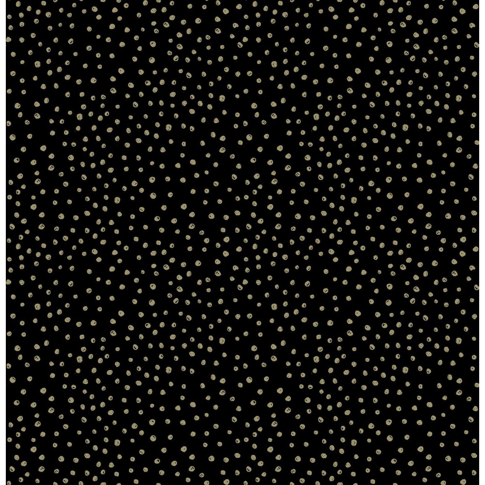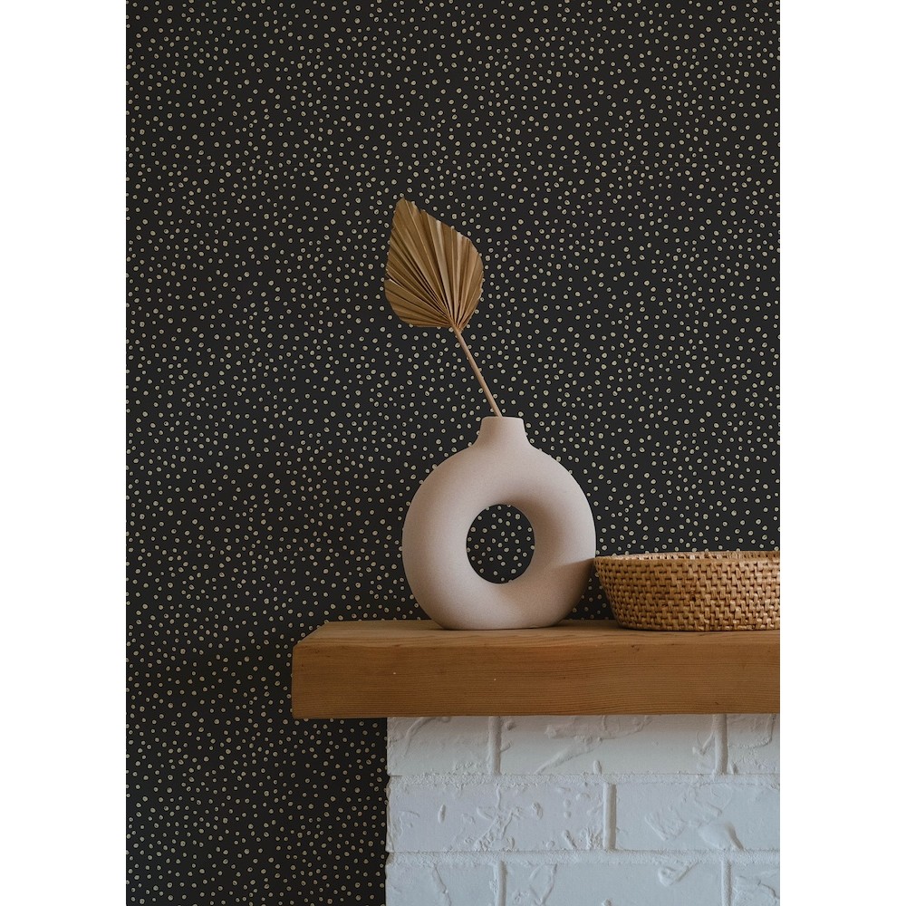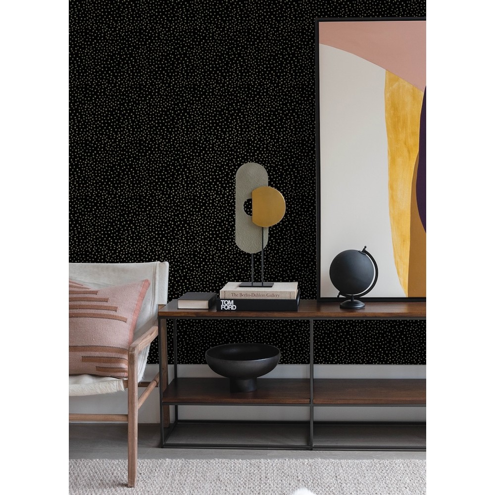 A dense collection of petite polka-dots are hand-painted for an extra dose of charm. The spots are burnished pale gold against an inky black background. Cassie is an unpasted, non woven wallpaper measuring 20.5 inches wide by 33 feet long, covering approximately About 56.4 square feet square feet per roll.
