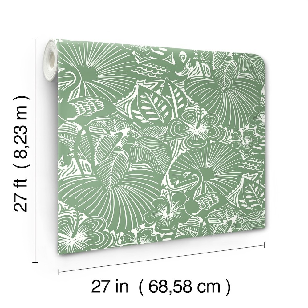 Flamingos strut their stuff through lush tropical flowers and foliage in this playful print. The pattern is illustrated in white against a cool green backdrop. Idalia is an unpasted, non woven wallpaper measuring 27 inches wide by 27 feet long, covering approximately About 60.8 square feet square feet per roll.