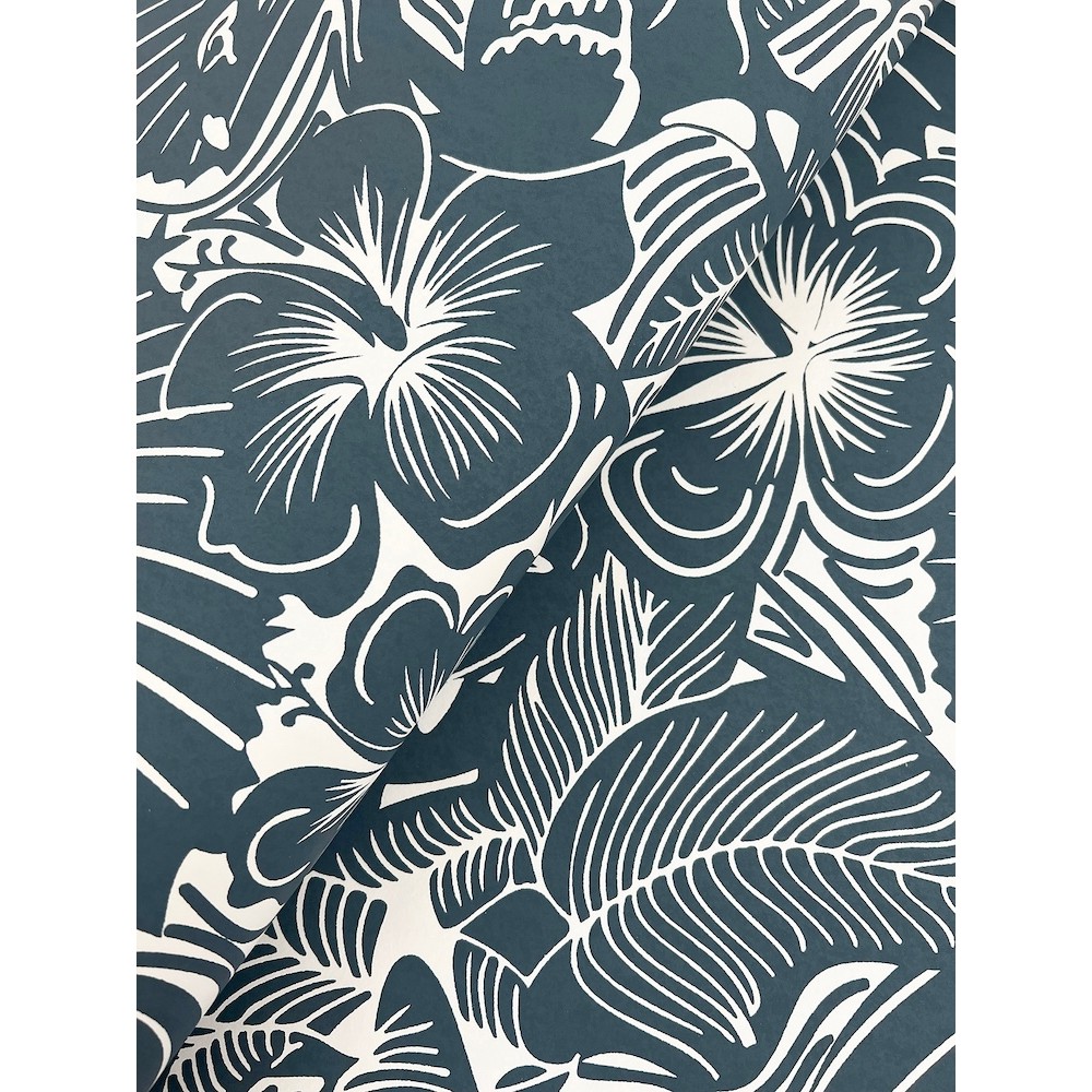 Flamingos strut their stuff through lush tropical flowers and foliage in this playful print. The pattern is illustrated in white against a deep blue backdrop. Idalia is an unpasted, non woven wallpaper measuring 27 inches wide by 27 feet long, covering approximately About 60.8 square feet square feet per roll.