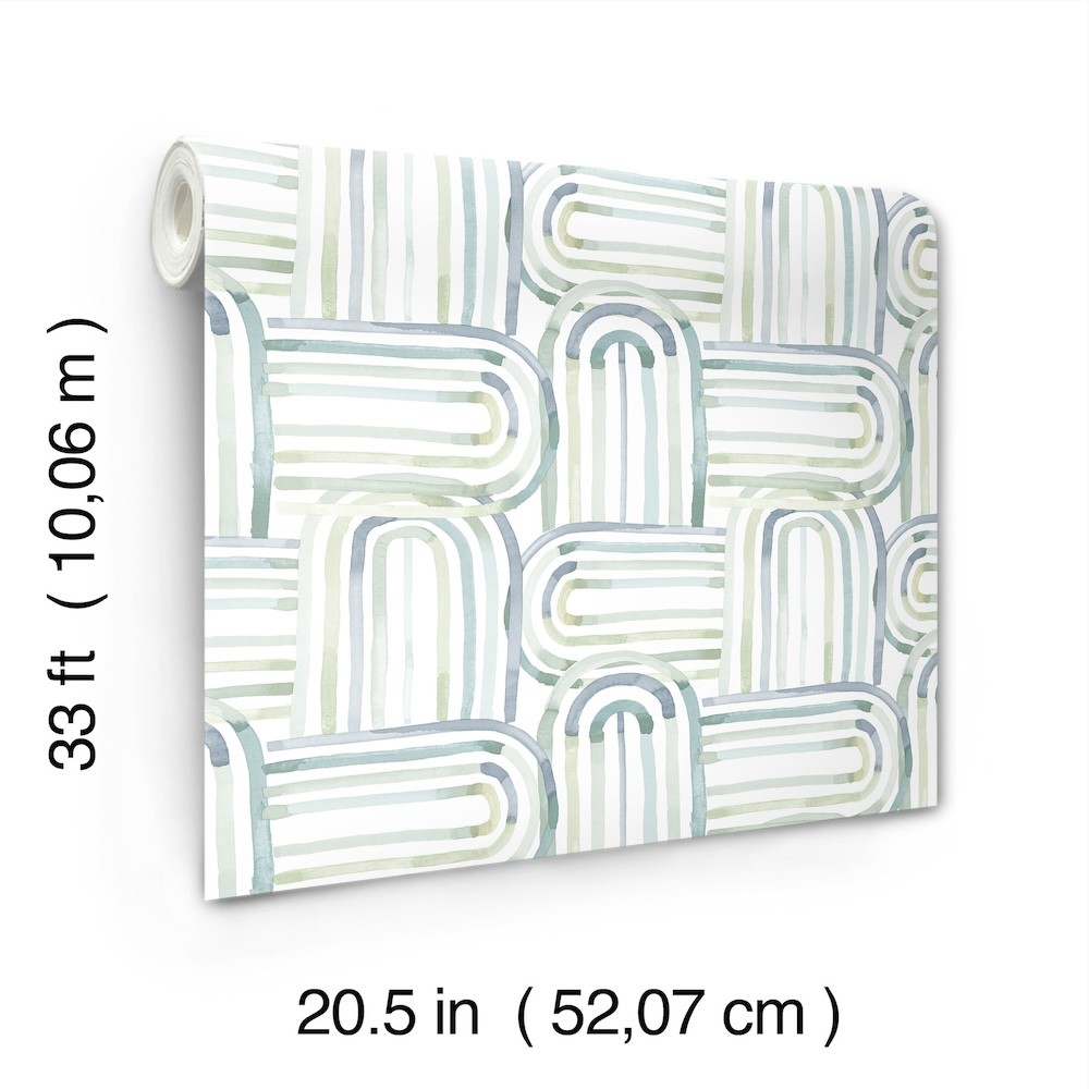 Watercolor arches are rotated and stacked in overlapping clusters in this playful wallpaper design. These simplified rainbows are inked in a cool blend of blues, greens, and teal. Lolly is an unpasted, non woven wallpaper measuring 20.5 inches wide by 33 feet long, covering approximately About 56.4 square feet square feet per roll.
