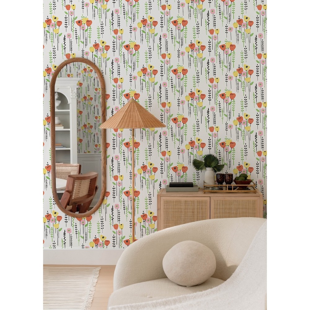 Painterly florals offer a simple and stylized take on a field of fresh, springtime blooms! The tall blossoms and grasses are painted in shades of vibrant yellow, pink, tangerine, green, and black against white. Mabel is an unpasted, non woven wallpaper measuring 20.5 inches wide by 33 feet long, covering approximately About 56.4 square feet square feet per roll.