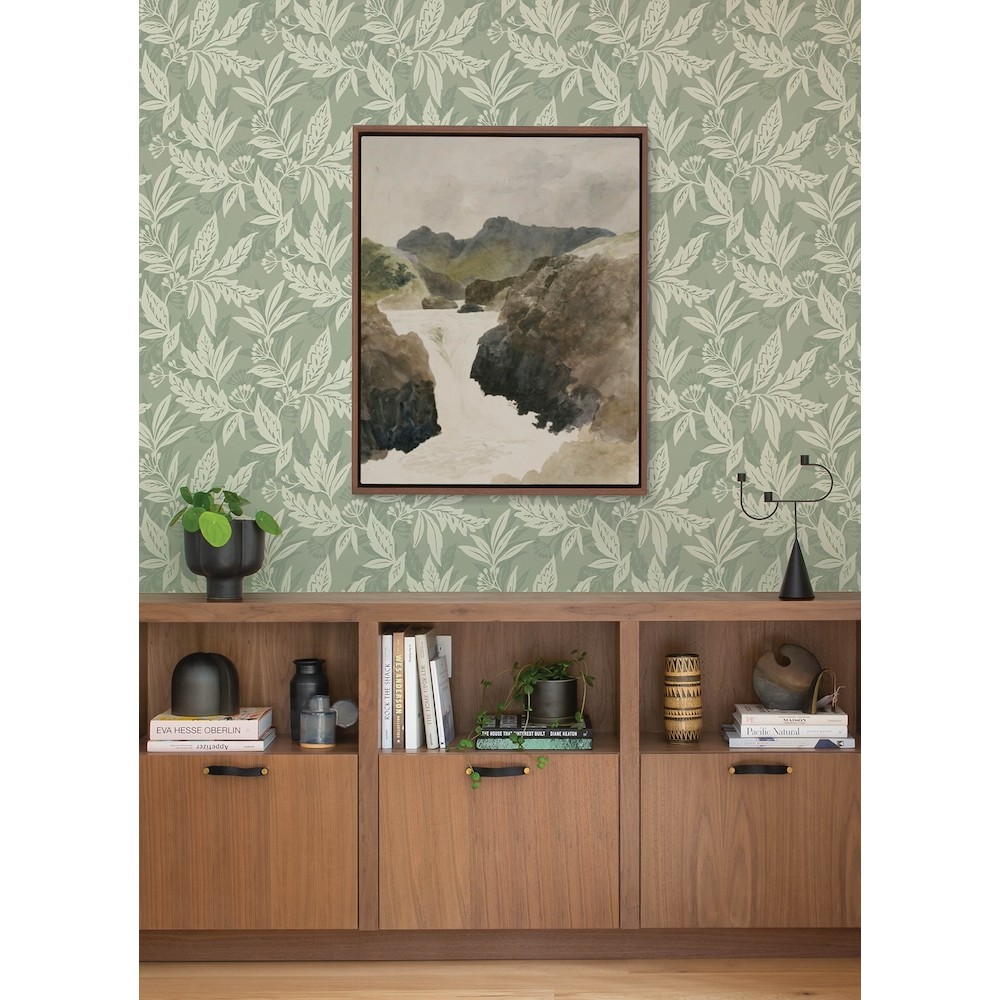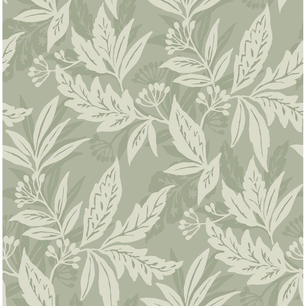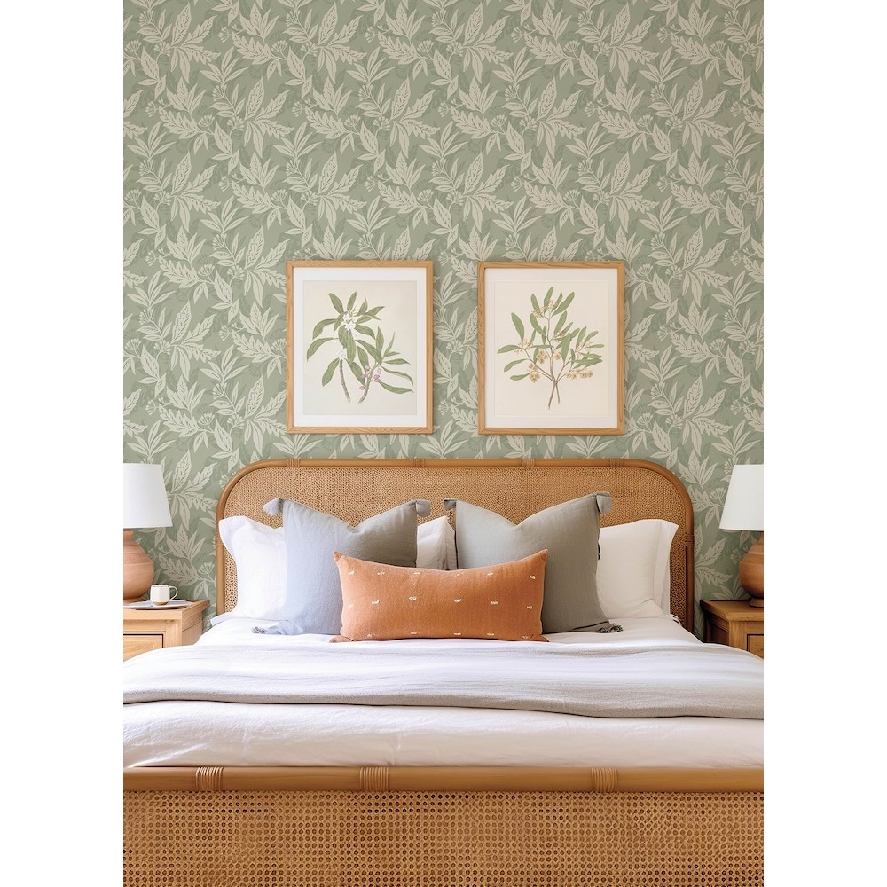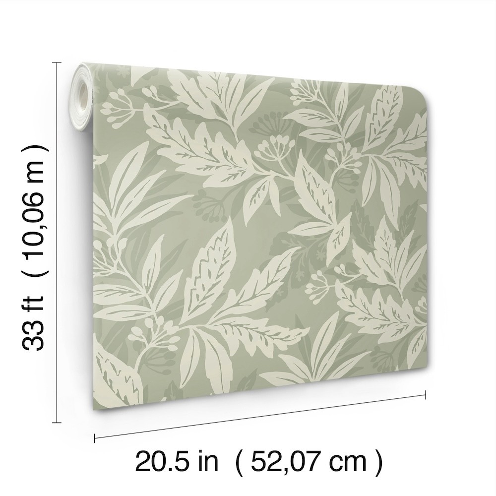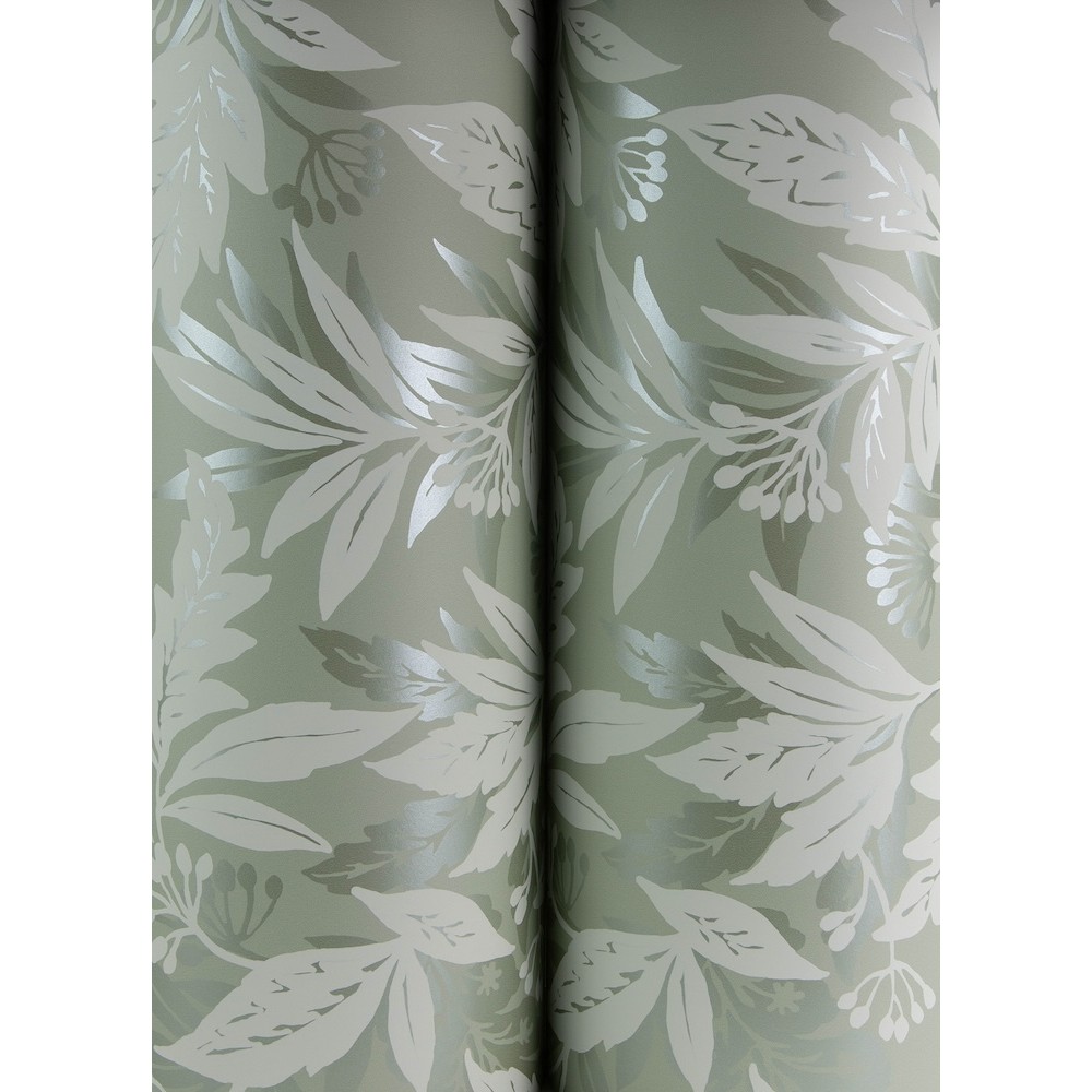Simple silhouettes of leafy, woodland flowers gain added sophistication from metallic shadowing. Seen here inked in palest sage shadowed by metallic green against a mossy green backdrop. Anita is an unpasted, non woven wallpaper measuring 20.5 inches wide by 33 feet long, covering approximately About 56.4 square feet square feet per roll.