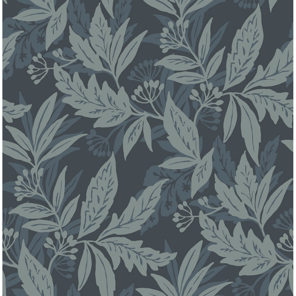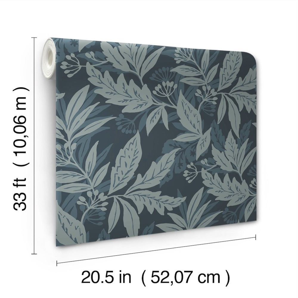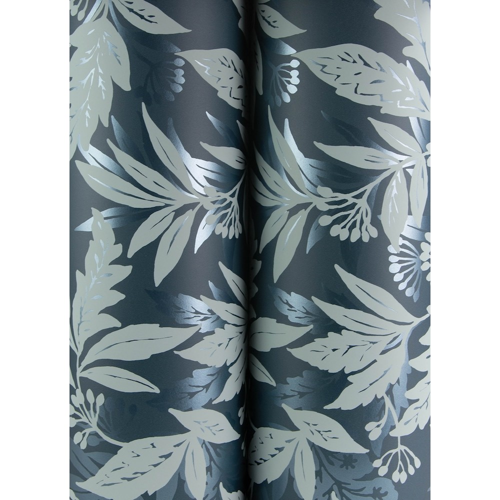 Simple silhouettes of leafy, woodland flowers gain added sophistication from metallic shadowing. Seen here inked in pale blue shadowed by metallic blue against a deep teal backdrop. Anita is an unpasted, non woven wallpaper measuring 20.5 inches wide by 33 feet long, covering approximately About 56.4 square feet square feet per roll.