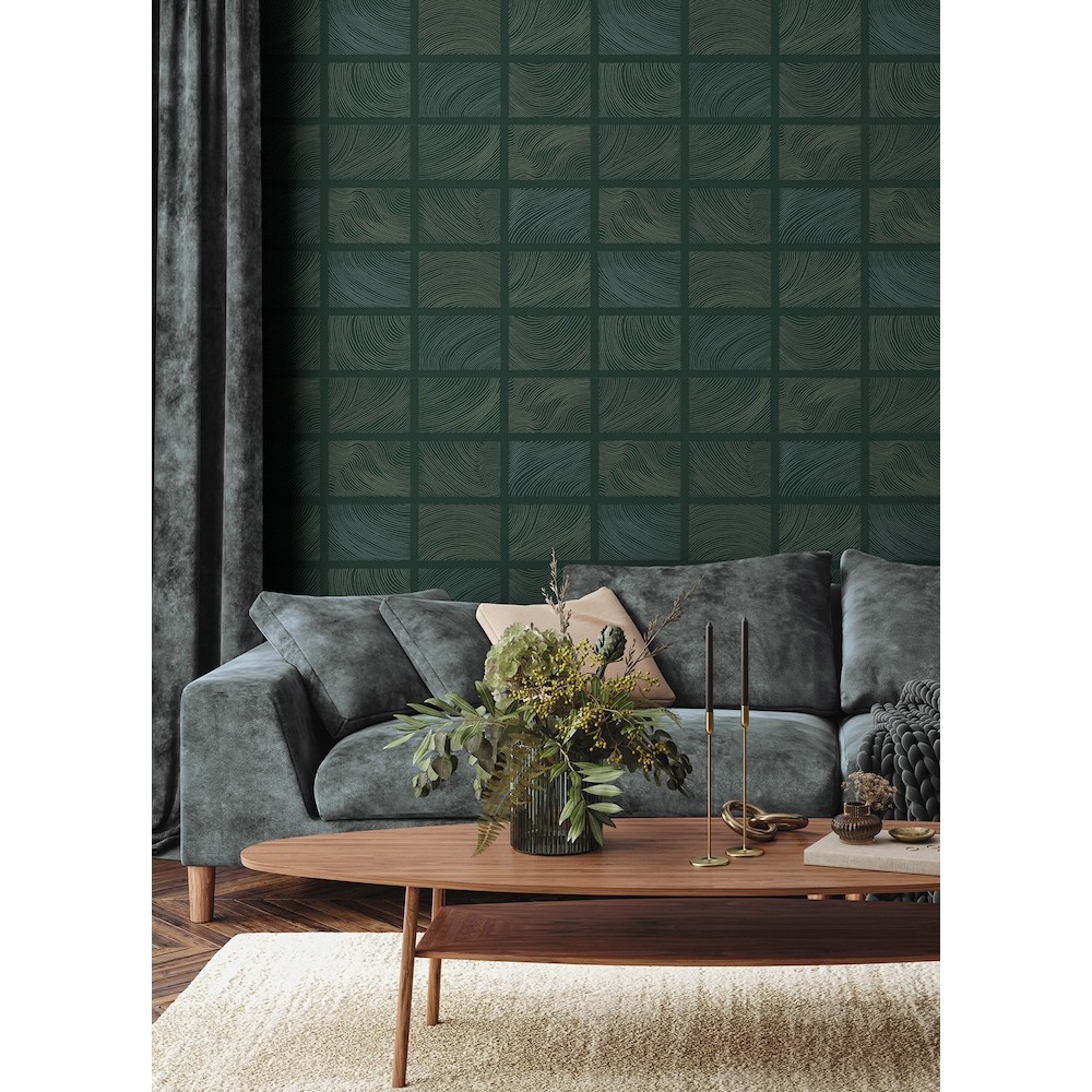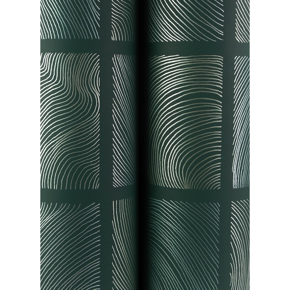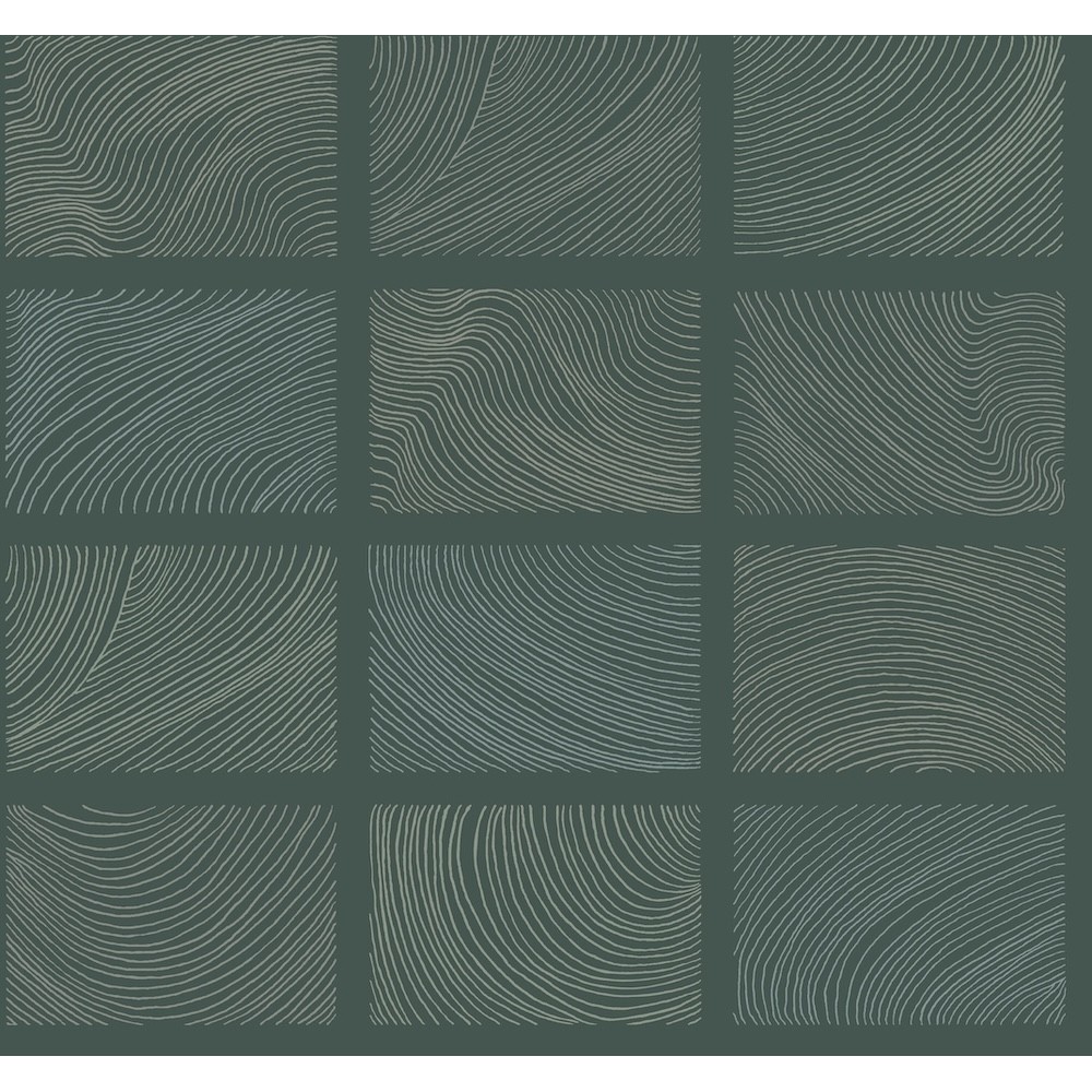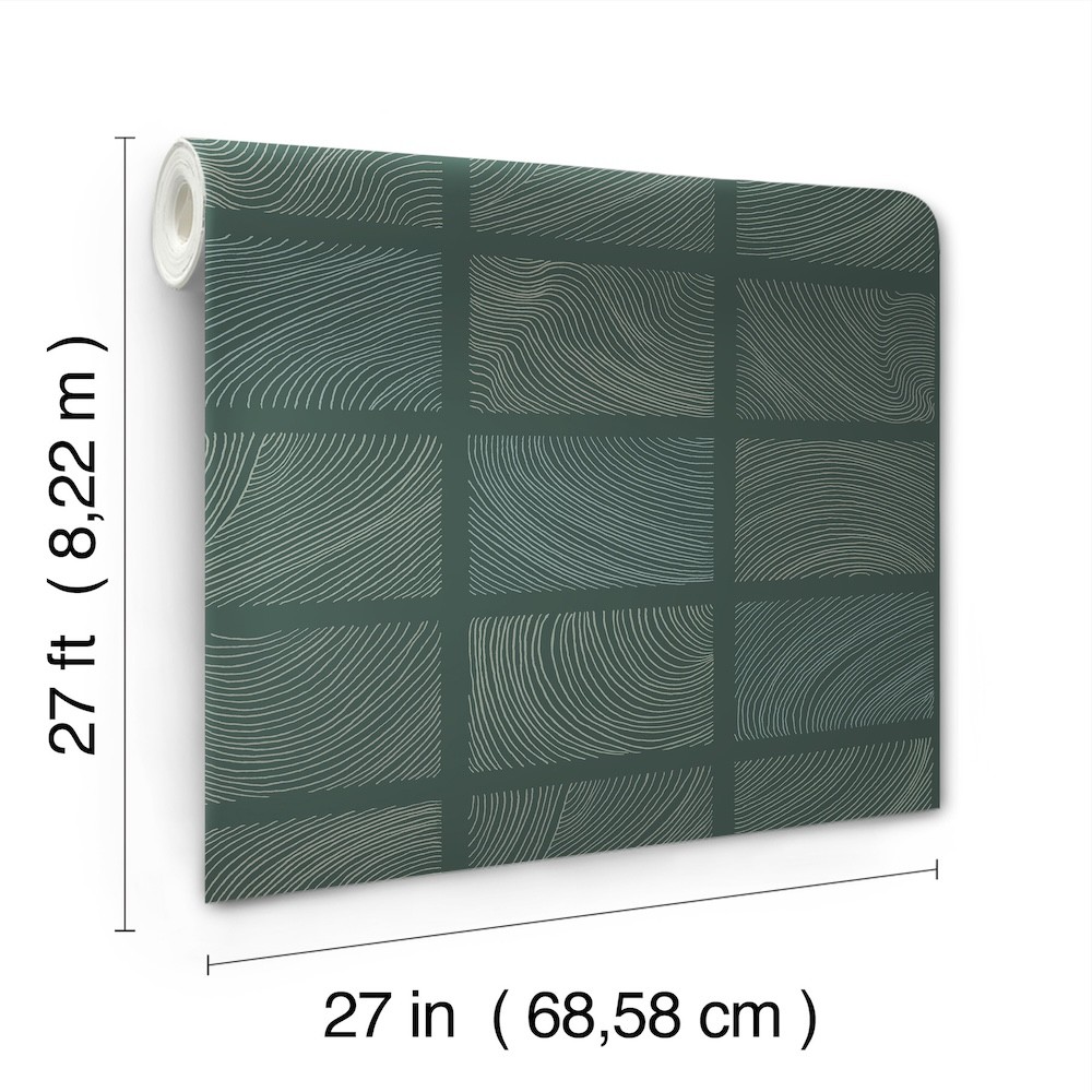 Bronson's gridded geometric design features blocks formed from softly waving, hand-drawn lines of metallic silver against deep emerald. Bronson is an unpasted, non woven wallpaper measuring 27 inches wide by 27 feet long, covering approximately About 60.8 square feet square feet per roll.