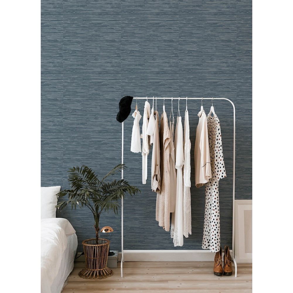 A replica of high-end grasscloth, this design features wide bands, knotted details, and prominent raised ink stitching. Featured here in a blend of rich blues with hints of teal. Exhale is an unpasted, non woven wallpaper measuring 20.5 inches wide by 33 feet long, covering approximately 56.4 square feet per roll.