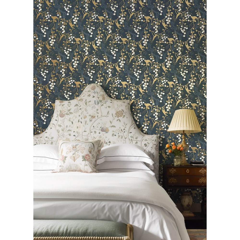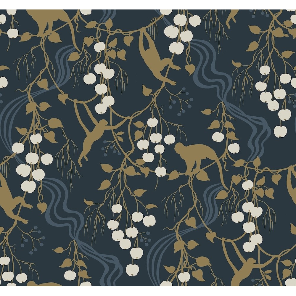 Monkeys swing and climb amongst vines laden with ripe fruit in this eclectic yet stately design. The scenic details are inked in metallic gold, denim, and white against a navy backdrop. Linden is an unpasted, non woven wallpaper measuring 27 inches wide by 27 feet long, covering approximately 60.8 square feet per roll.