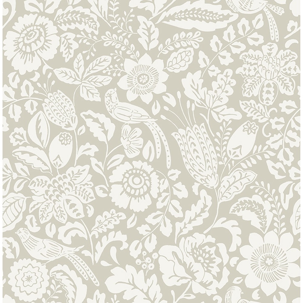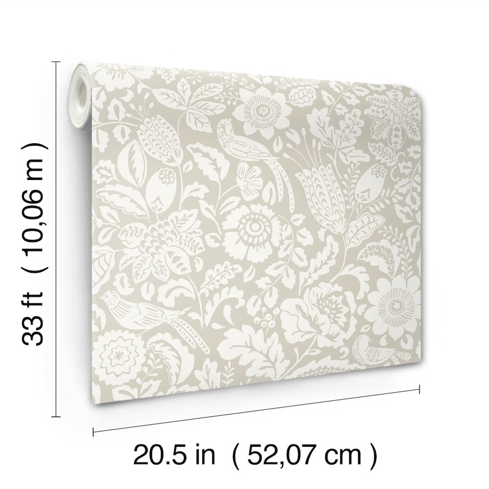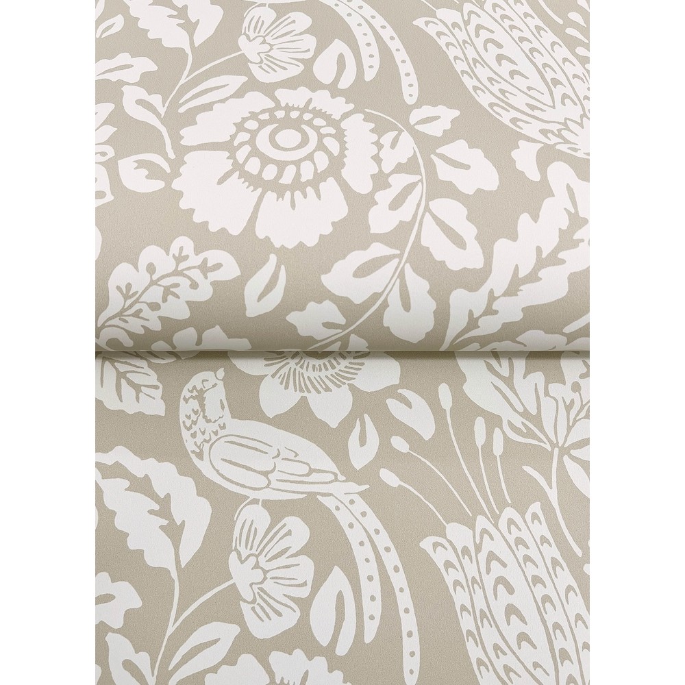 Nightingales perch amidst a medley of decorative florals in this charming trail wallpaper. The birds and botanicals are stamped in white along a beige backdrop. Marta is an unpasted, non woven wallpaper measuring 20.5 inches wide by 33 feet long, covering approximately 56.4 square feet per roll.
