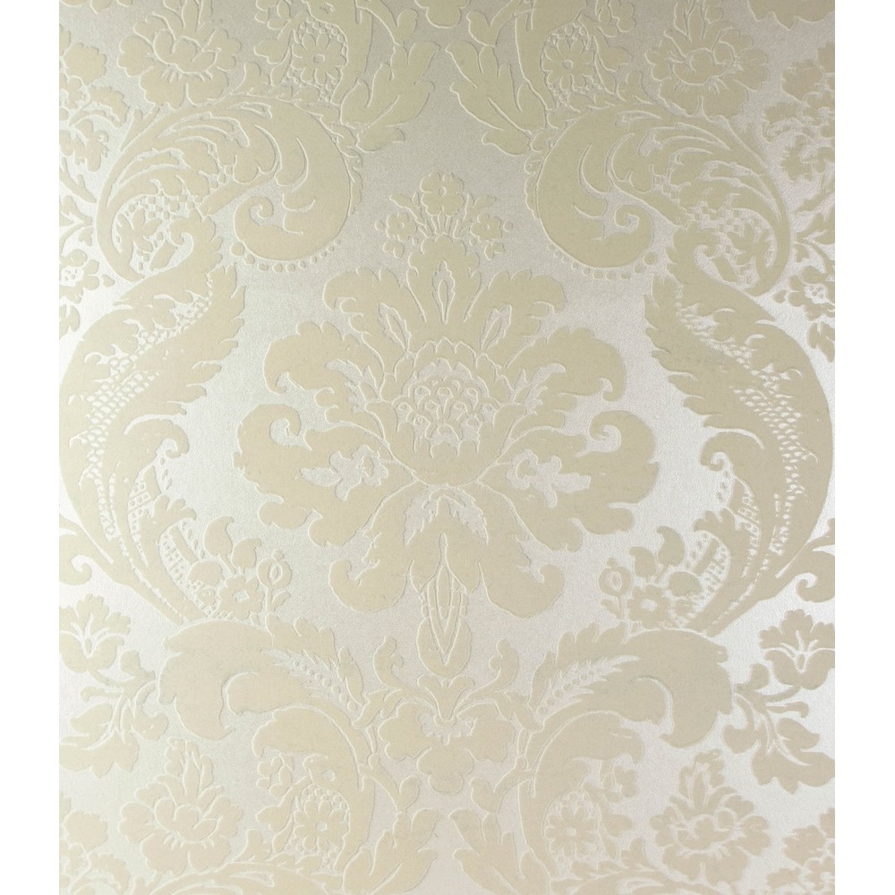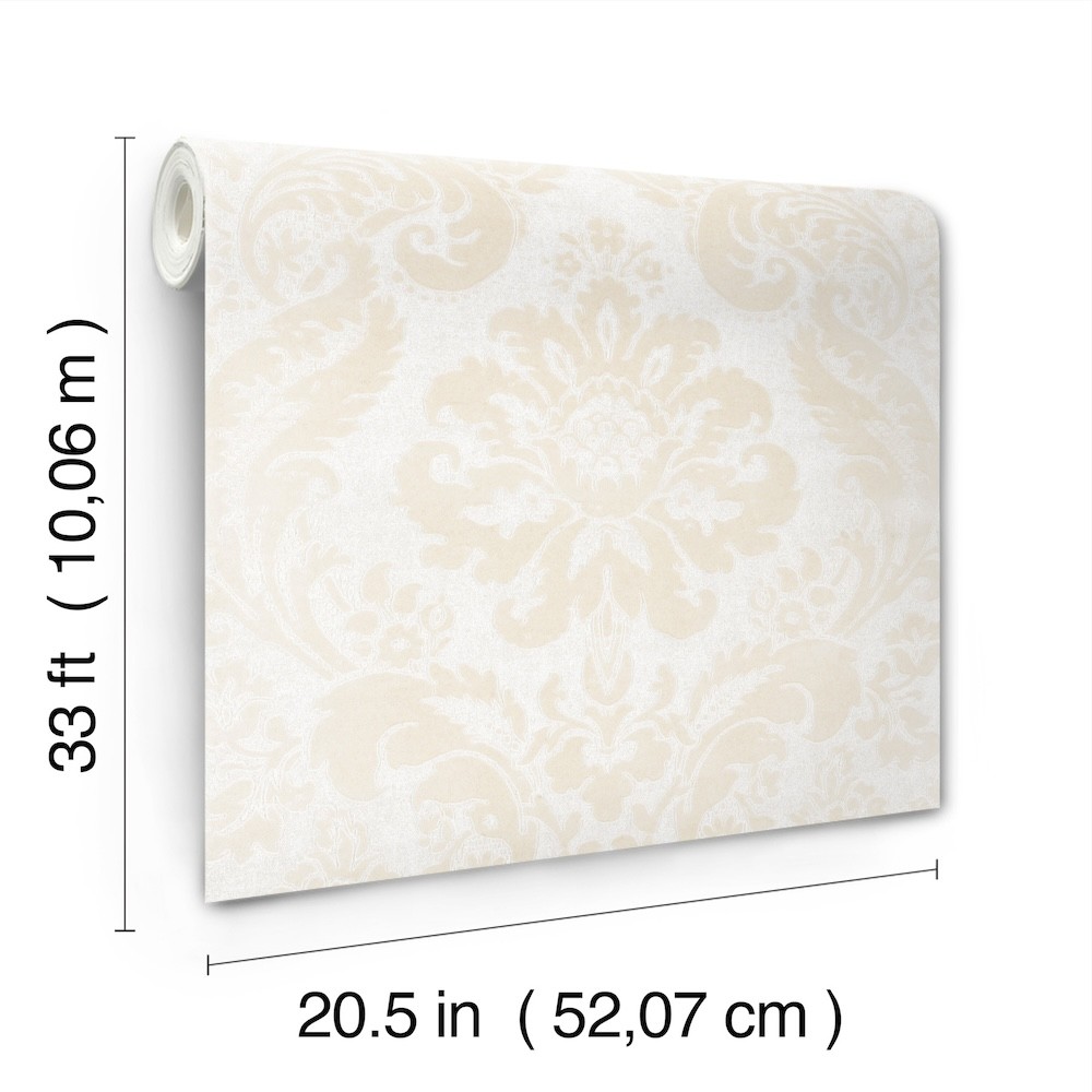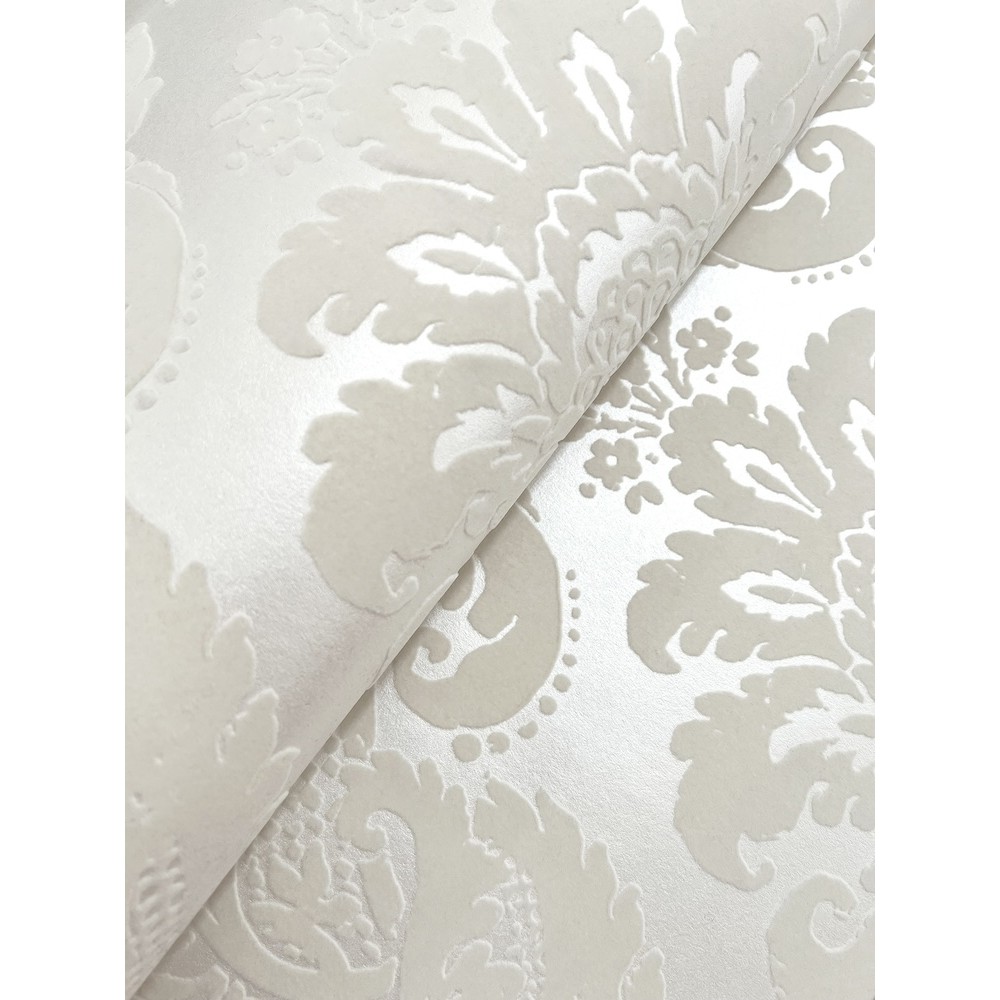 This opulent damask wallpaper features a classic floral medallion framed by leafy scrolls and floral vines, all formed from velvety creamy-white flock against a pearlescent background. Shadow is an unpasted, non woven wallpaper measuring 20.5 inches wide by 33 feet long, covering approximately 56.4 square feet per roll.