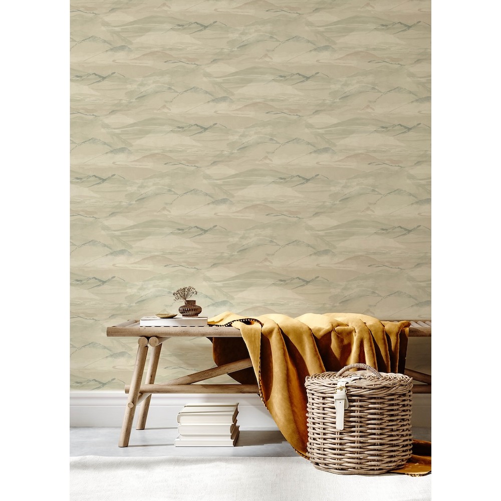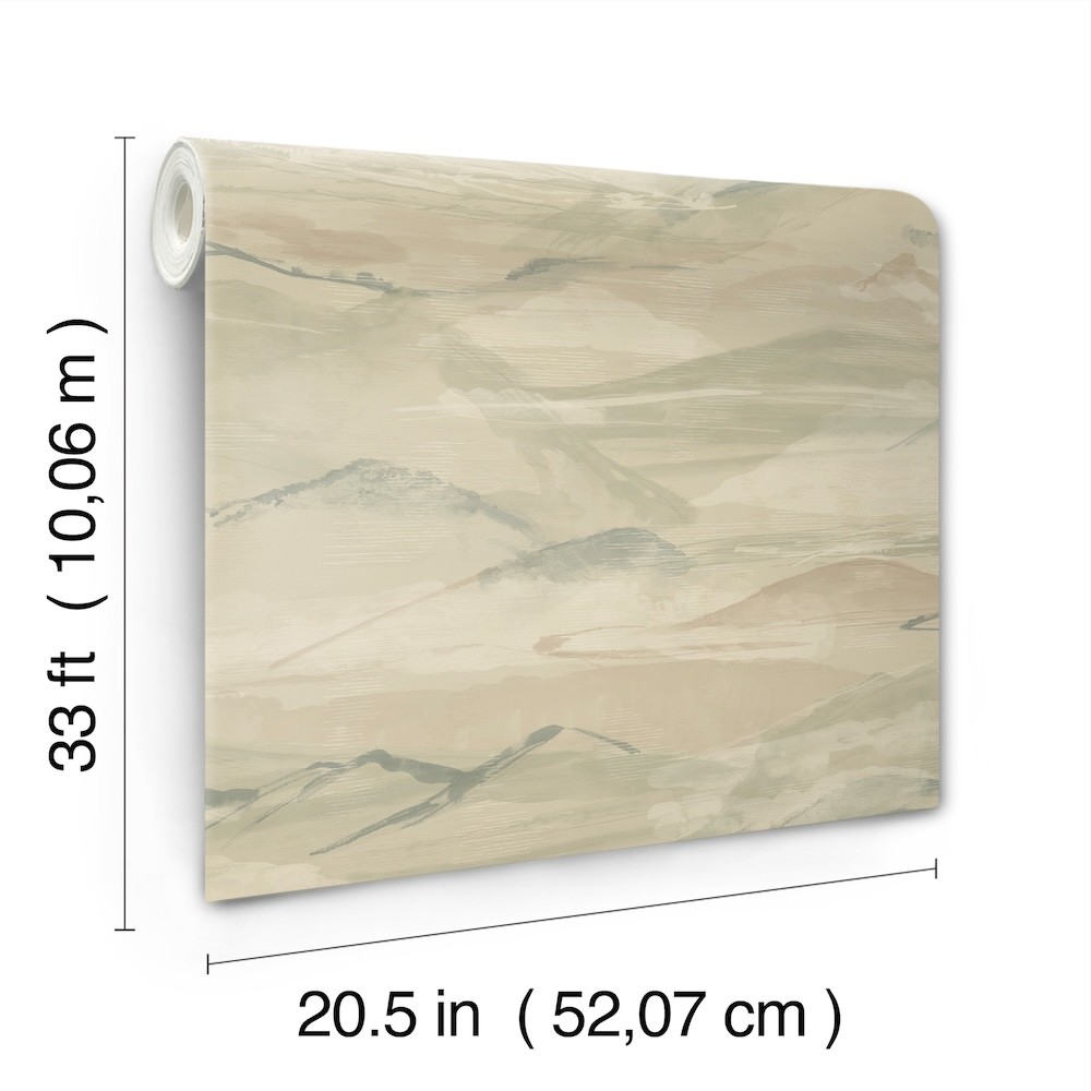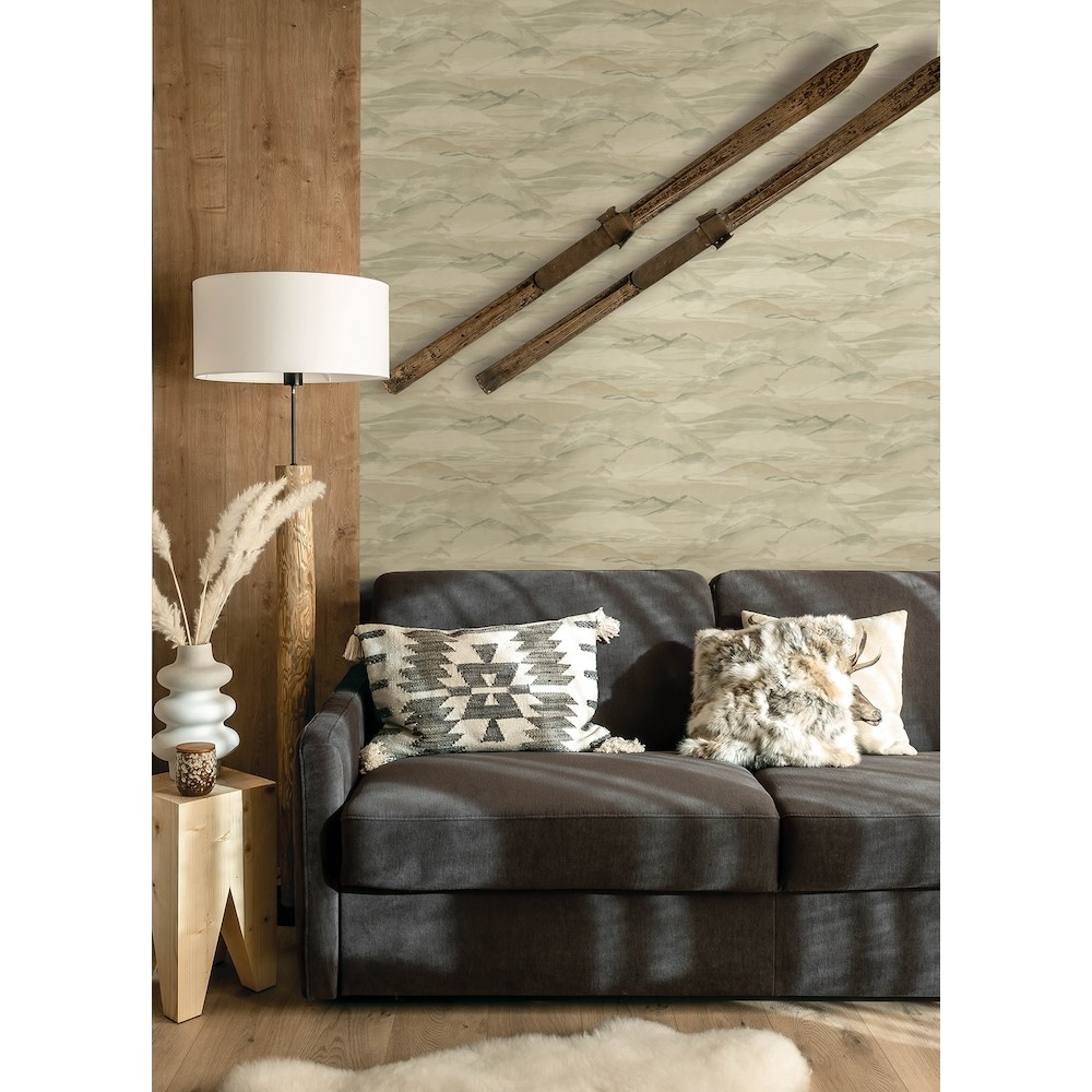 This hallmark of the iconic Montana landscape is artistically recreated on wallpaper. The illustrative design features a restricted palette of pale green, blue, and taupe, soft watercolor forms, and the feeling of mist drifting over the mountain range. Bozeman Mountains is a prepasted, non woven wallpaper measuring 20.5 inches wide by 33 feet long, covering approximately About 56.4 square feet square feet per roll.