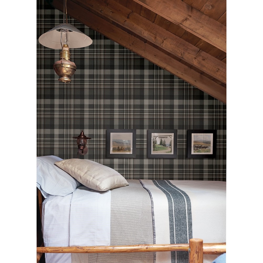 As hardy and enduring as the Duttons themselves, this plaid design features an intricate interplay of stripes and squares in a range of black, grey, and rust-red hues. Dutton Plaid is a prepasted, non woven wallpaper measuring 20.5 inches wide by 33 feet long, covering approximately About 56.4 square feet square feet per roll.