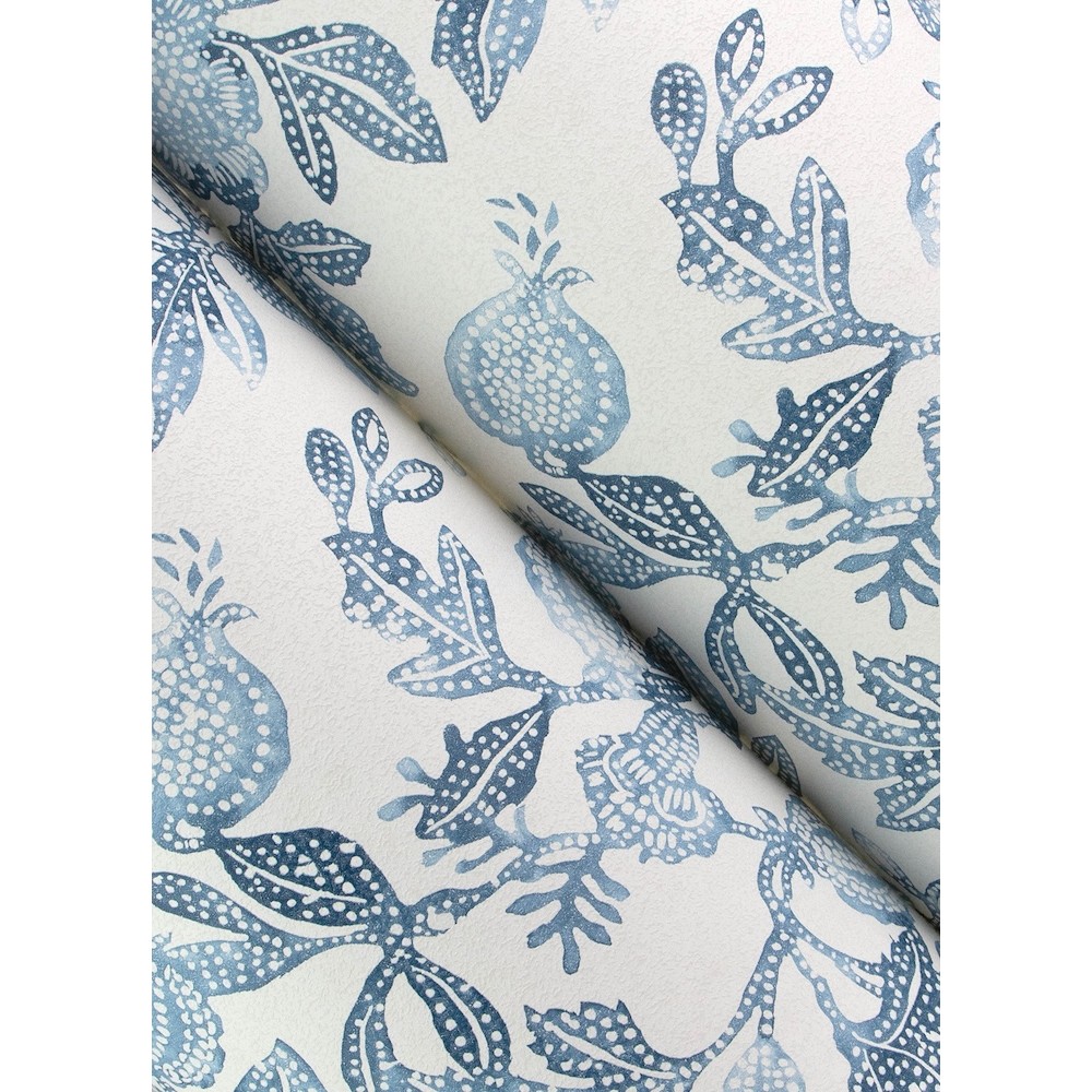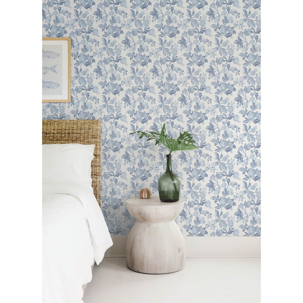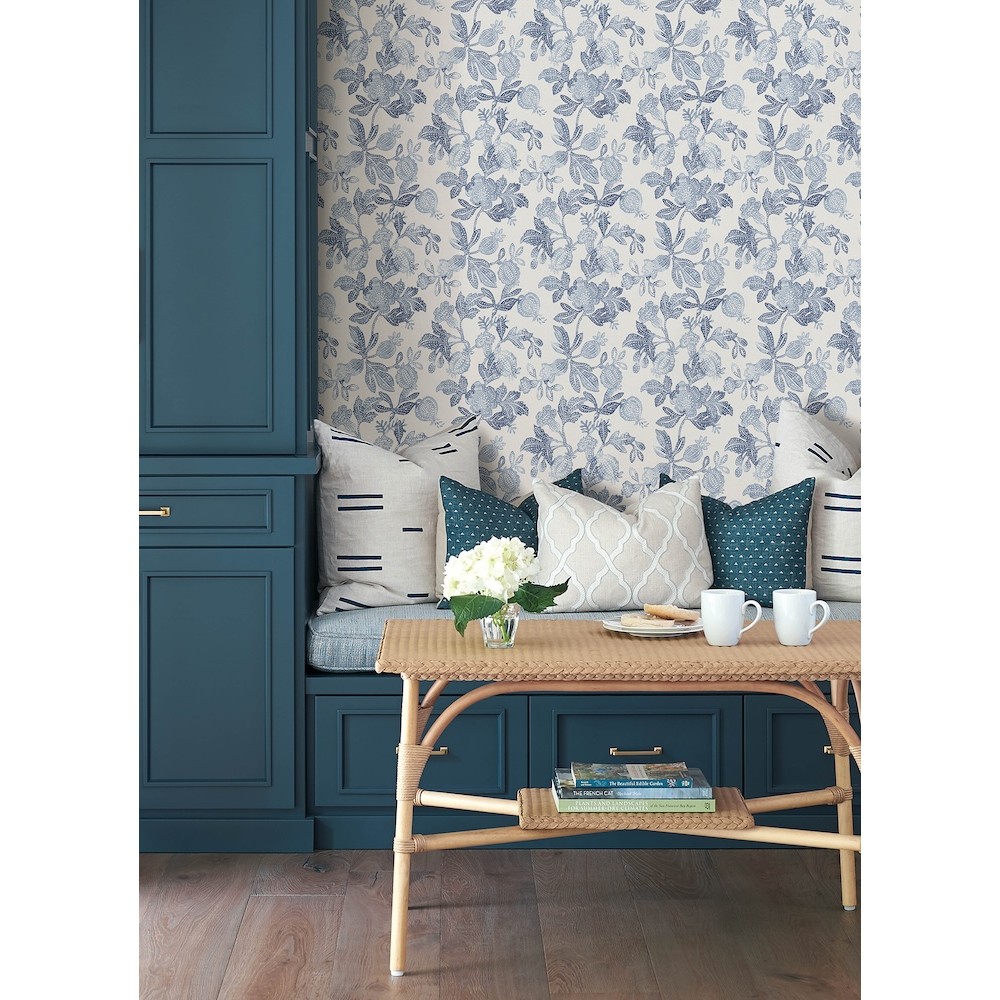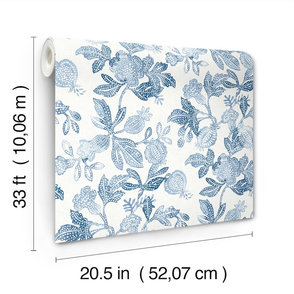 Beachside florals and fruits are artistically recreated as gorgeous trail wallpaper, inked in shades of rich blue and embellished with stippled detailing and tactile finishes. Beach Rose is an unpasted, non woven wallpaper measuring 20.5 inches wide by 33 feet long, covering approximately 56.4 square feet per roll.