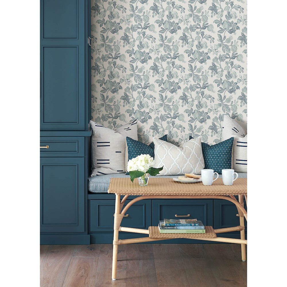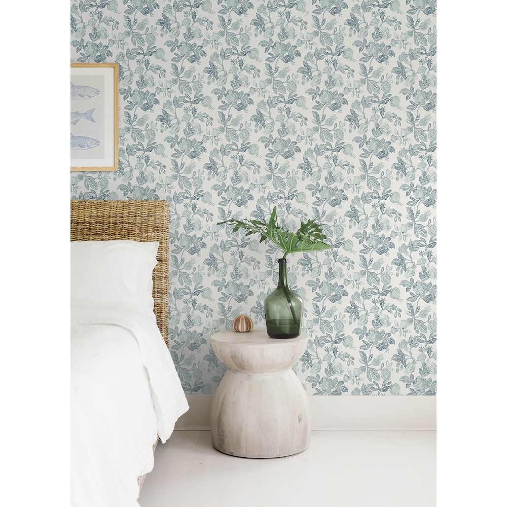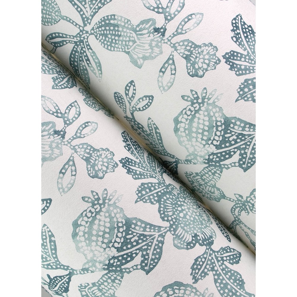 Beachside florals and fruits are artistically recreated as gorgeous trail wallpaper, inked in shades of rich teal and embellished with stippled detailing and tactile finishes. Beach Rose is an unpasted, non woven wallpaper measuring 20.5 inches wide by 33 feet long, covering approximately 56.4 square feet per roll.