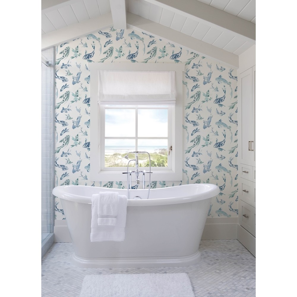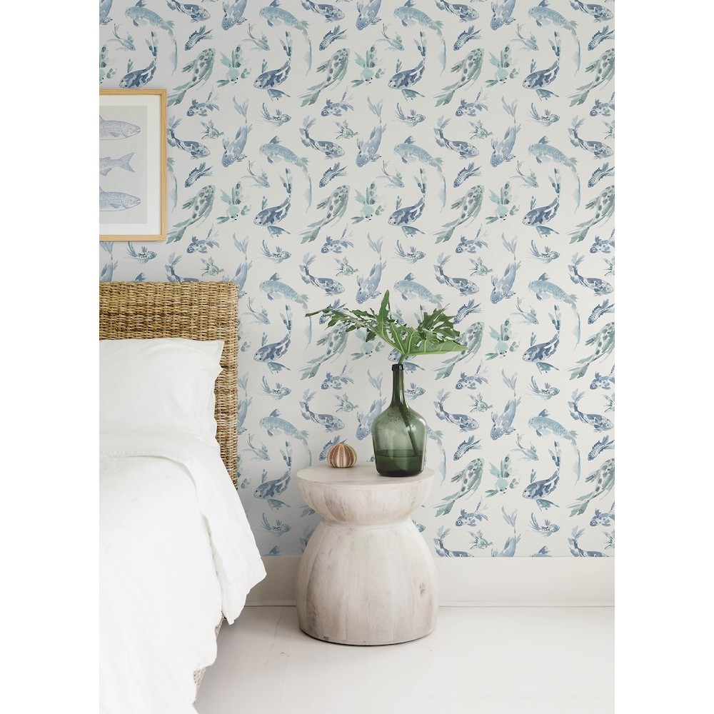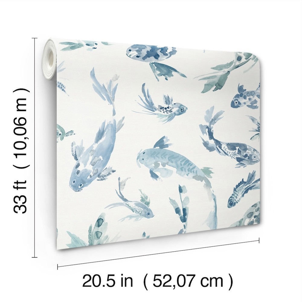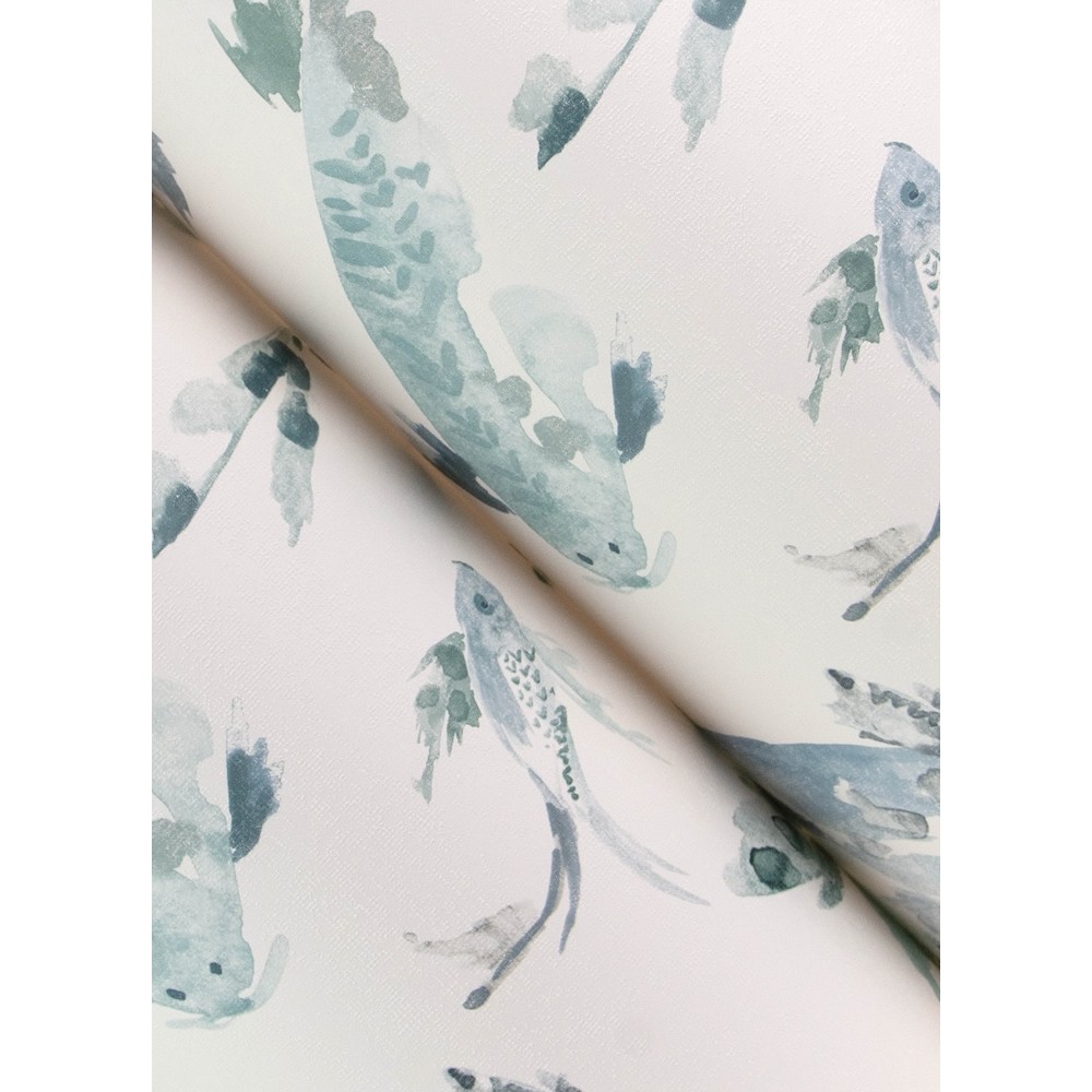 Koi and goldfish swim in hypnotic circles, the design's flowing watercolors adding to its sense of movement and tranquility. Seen here in a cool palette of indigo, denim, teal, and sea green accentuated by subtle raised inks. Koi is an unpasted, non woven wallpaper measuring 20.5 inches wide by 33 feet long, covering approximately 56.4 square feet per roll.