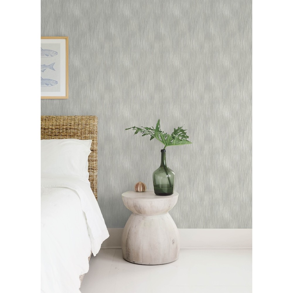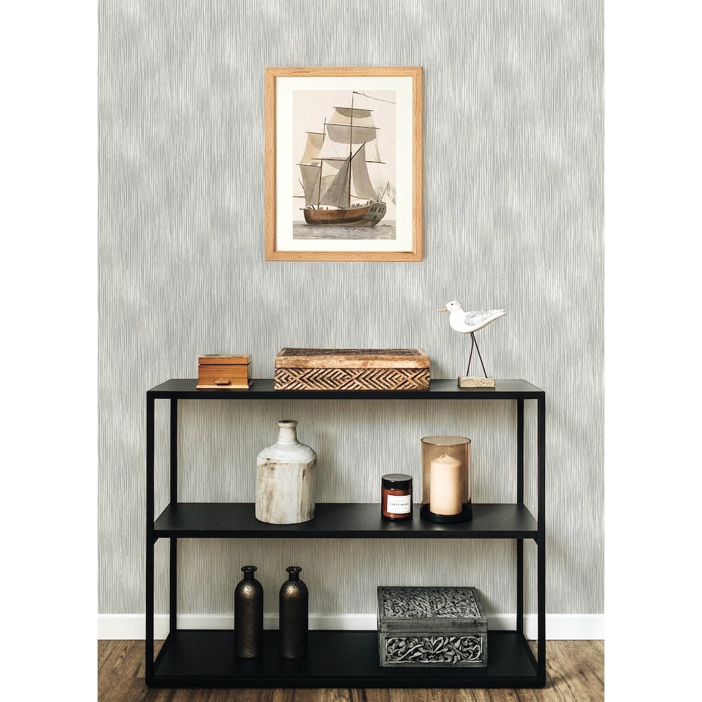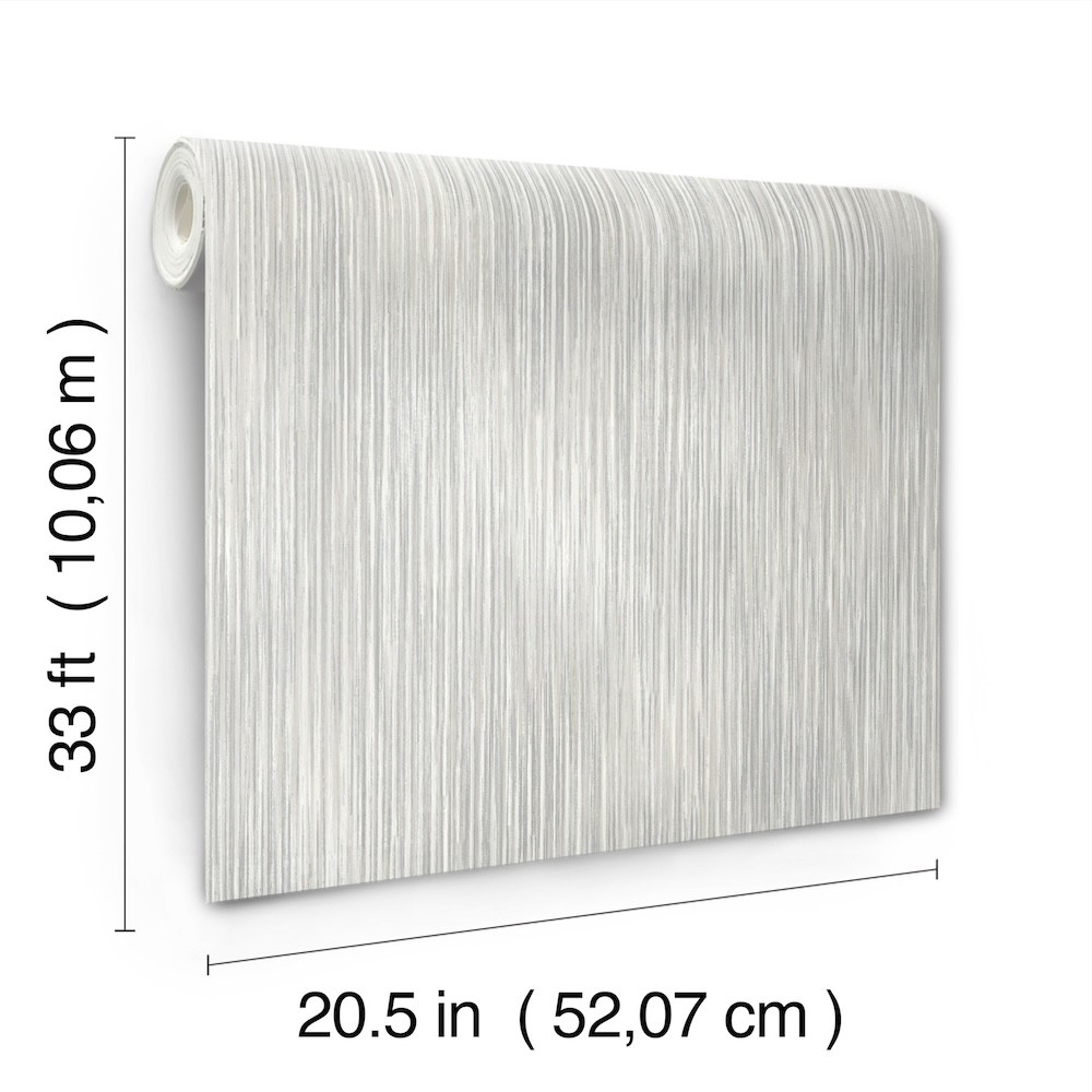 Vertical stripes feature a grey palette that subtly shifts between smoke, pale grey, steel blue, dove, and beige, all accentuated by the tactility of raised ink detailing. Largo is an unpasted, non woven wallpaper measuring 20.5 inches wide by 33 feet long, covering approximately 56.4 square feet per roll.