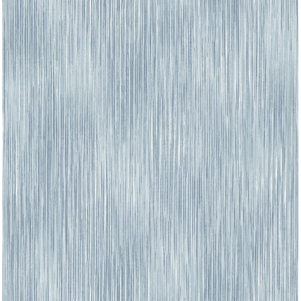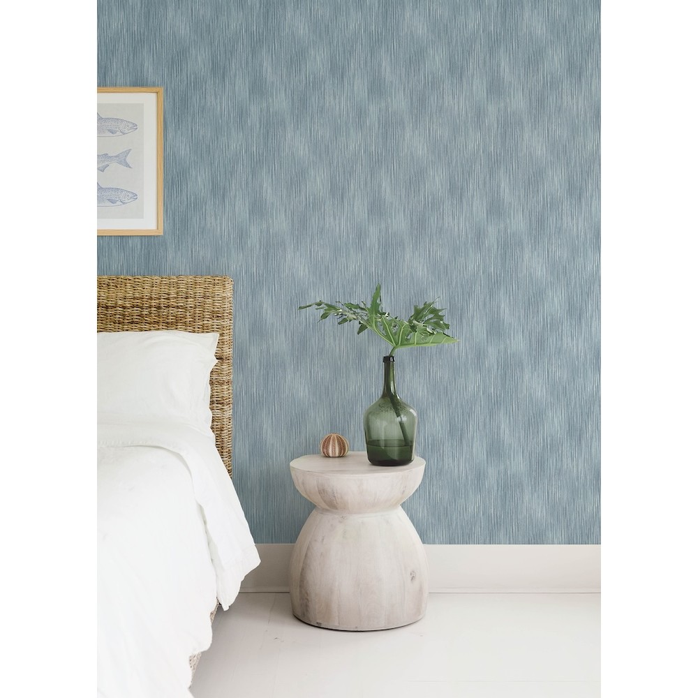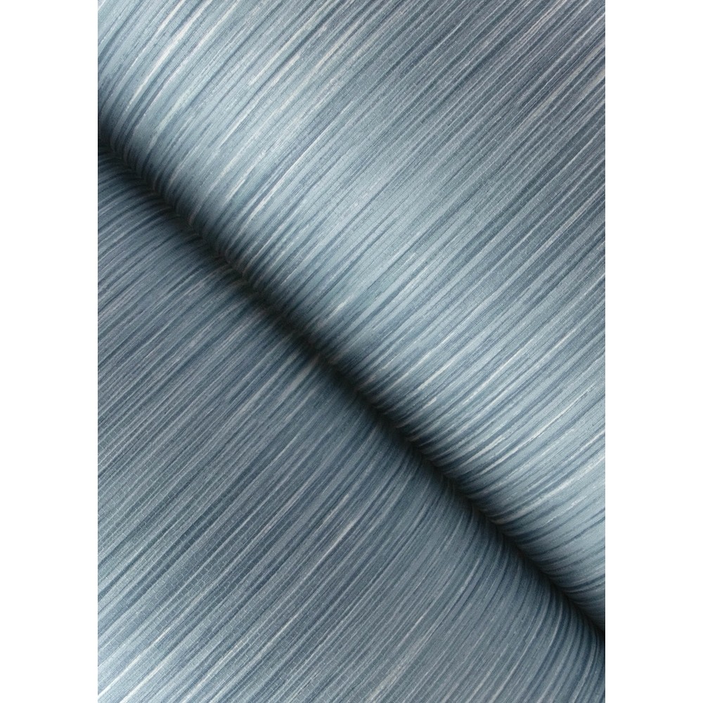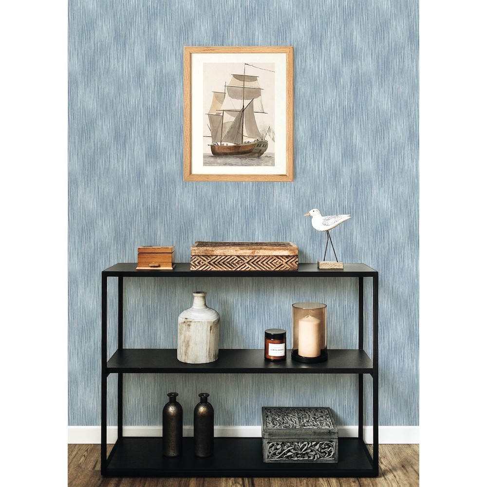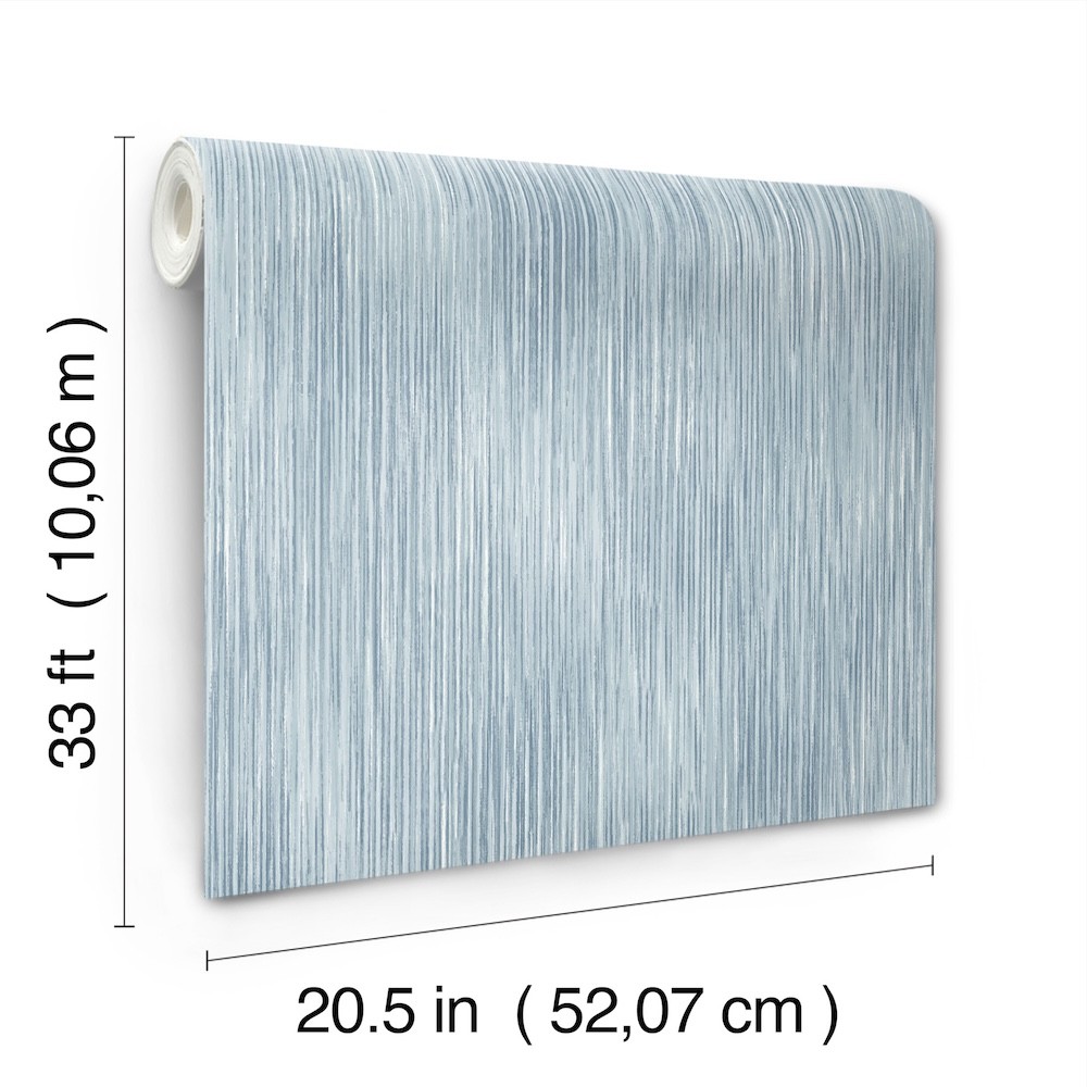 Vertical stripes feature a rich blue palette that subtly shifts between denim, indigo, periwinkle, and pale teal, all accentuated by the tactility of raised ink detailing. Largo is an unpasted, non woven wallpaper measuring 20.5 inches wide by 33 feet long, covering approximately 56.4 square feet per roll.