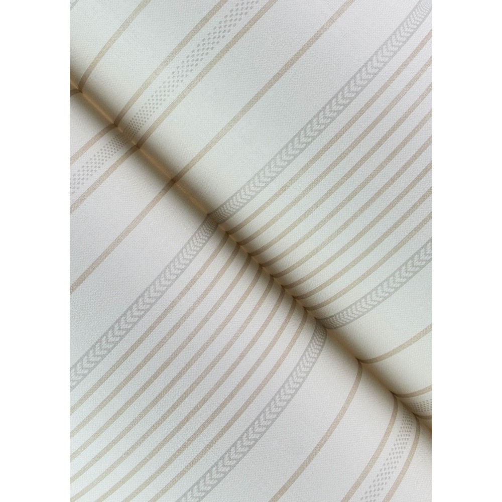 Beige pinstripes, plaited details, and subtle tactility recreates the elegance of French linen with modern embellishments. Navarres Stripe is an unpasted, non woven wallpaper measuring 20.5 inches wide by 33 feet long, covering approximately 56.4 square feet per roll.
