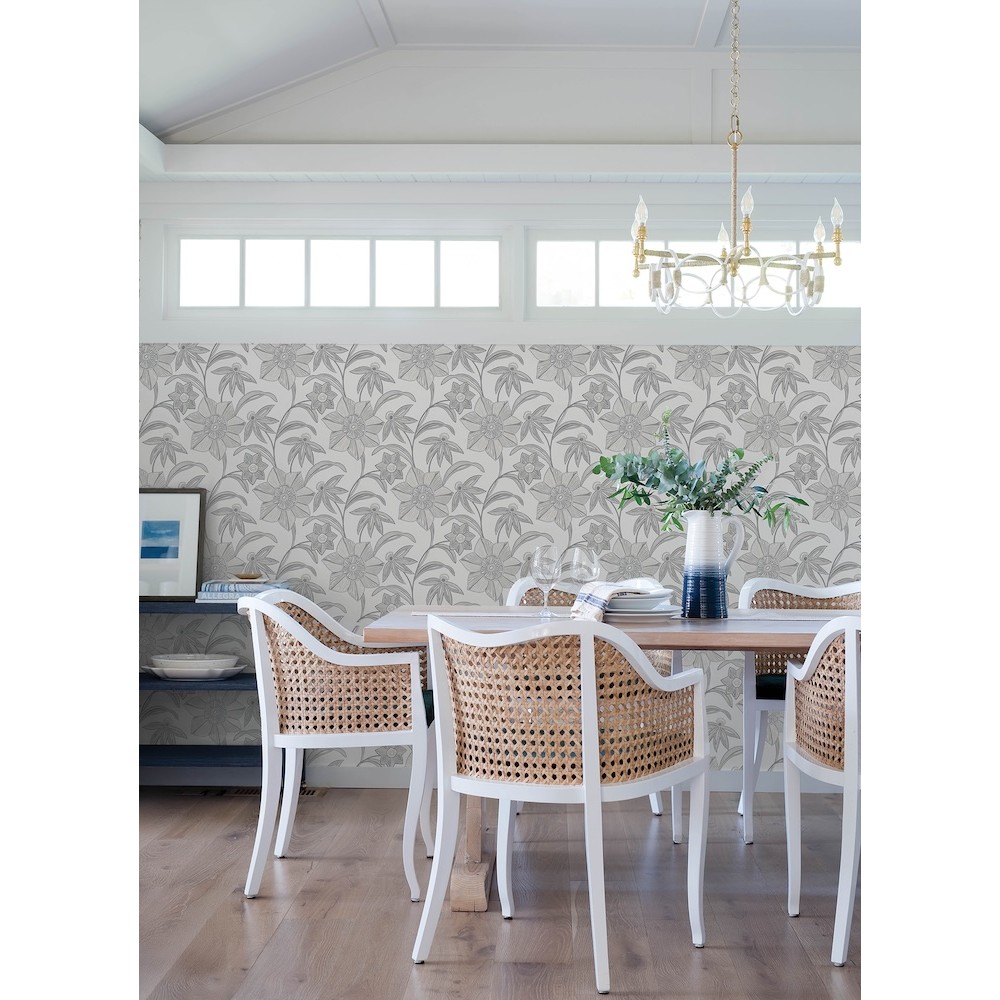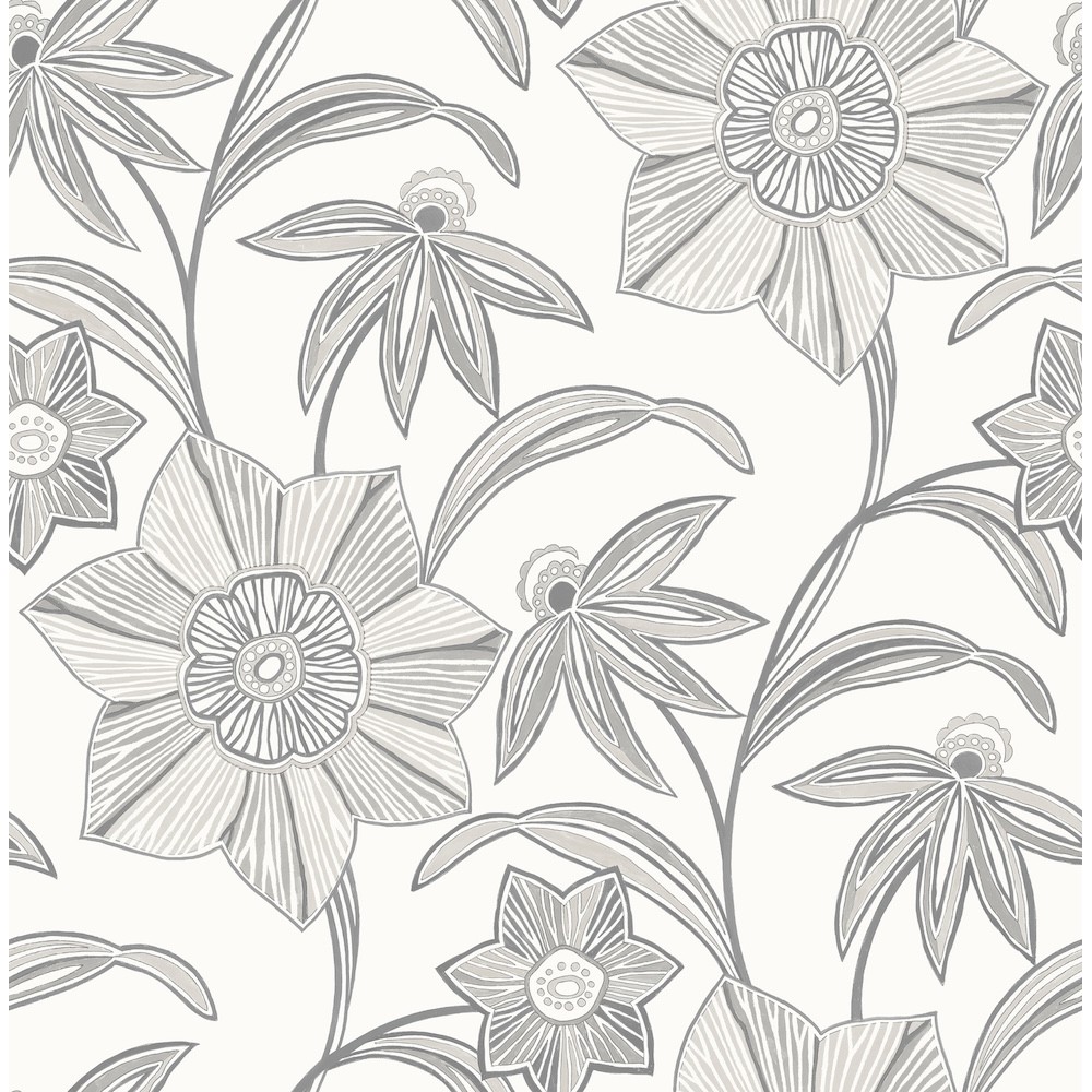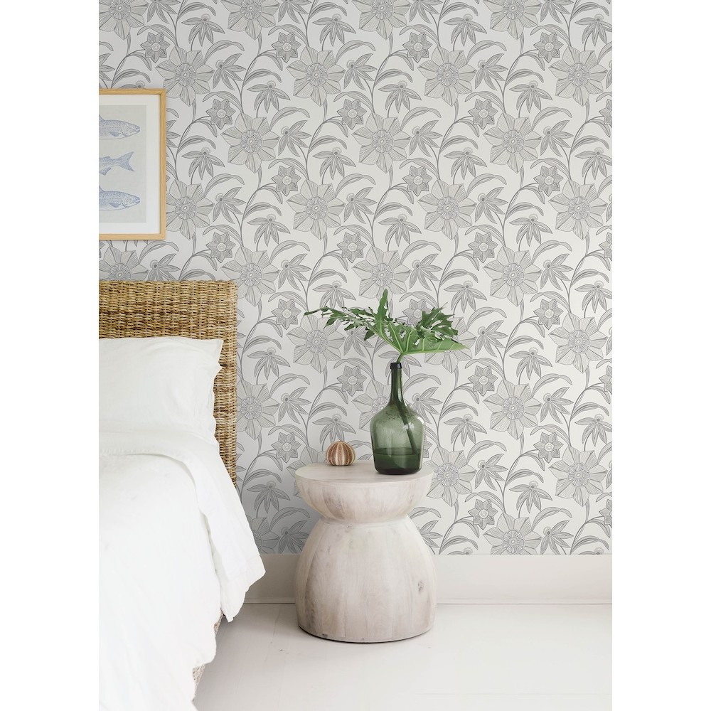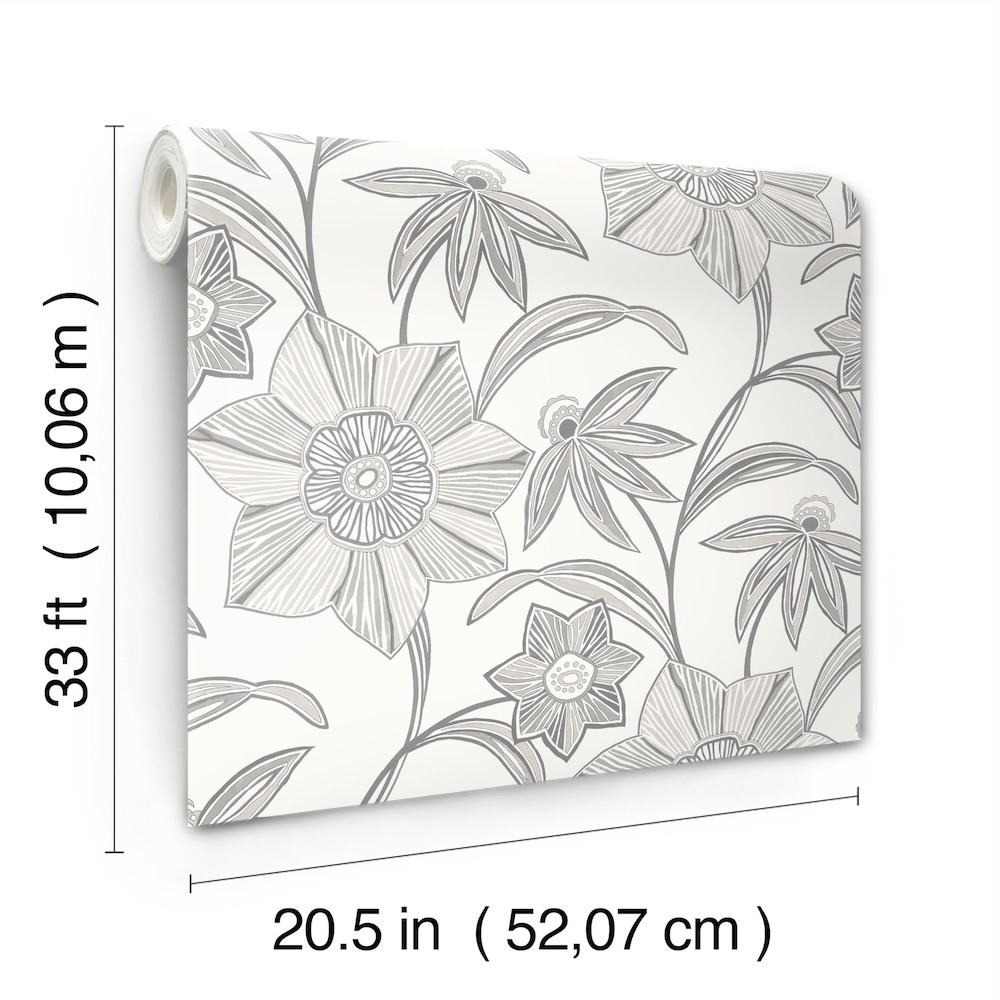 Voluminous, celestial-shaped blooms form twining trails in this artistic floral design. The linework is inked in shades of grey against white. Star Flower is an unpasted, non woven wallpaper measuring 20.5 inches wide by 33 feet long, covering approximately 56.4 square feet per roll.