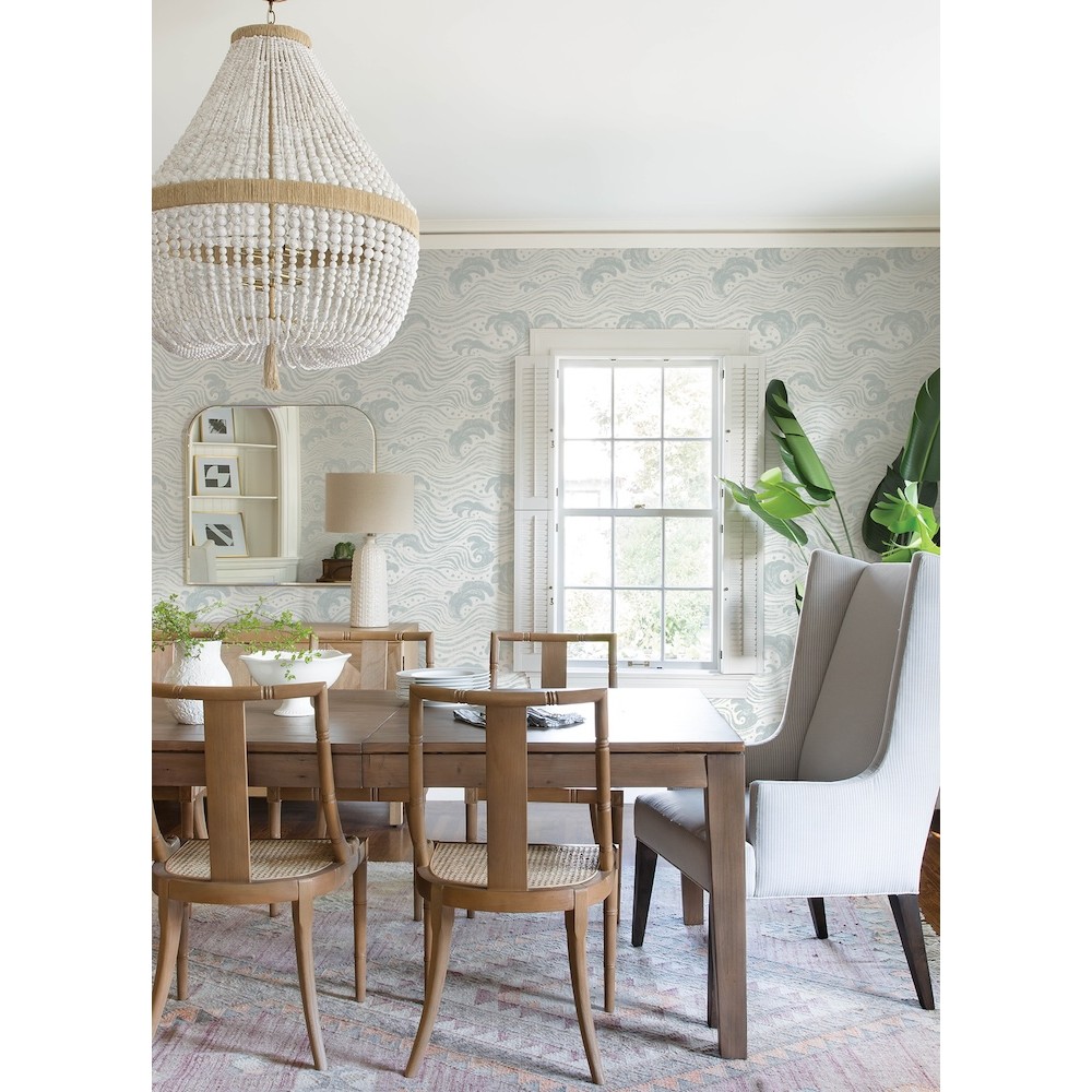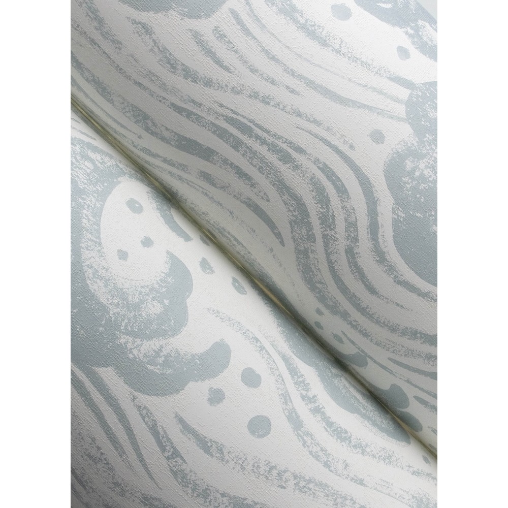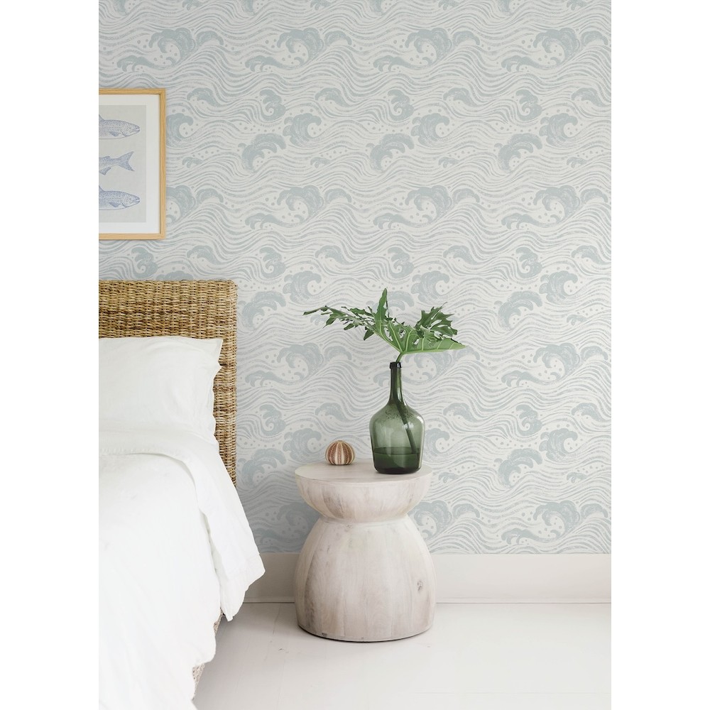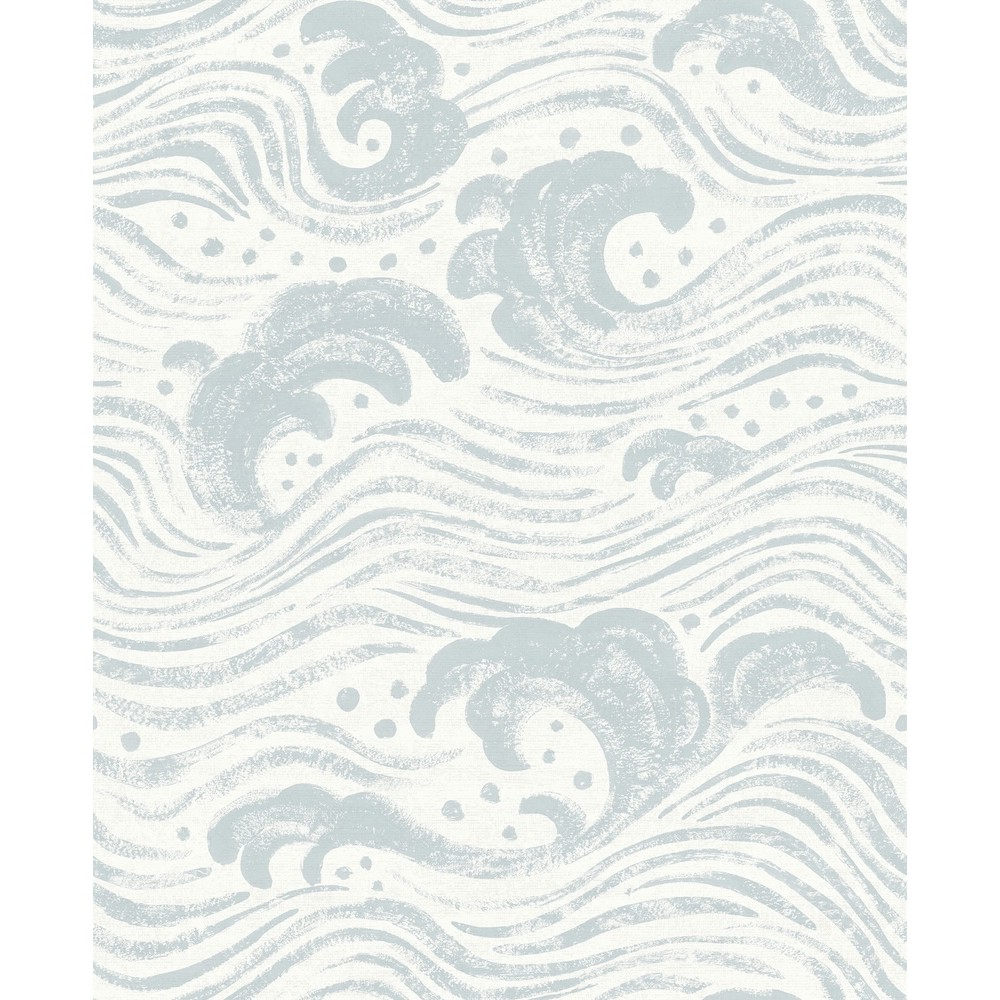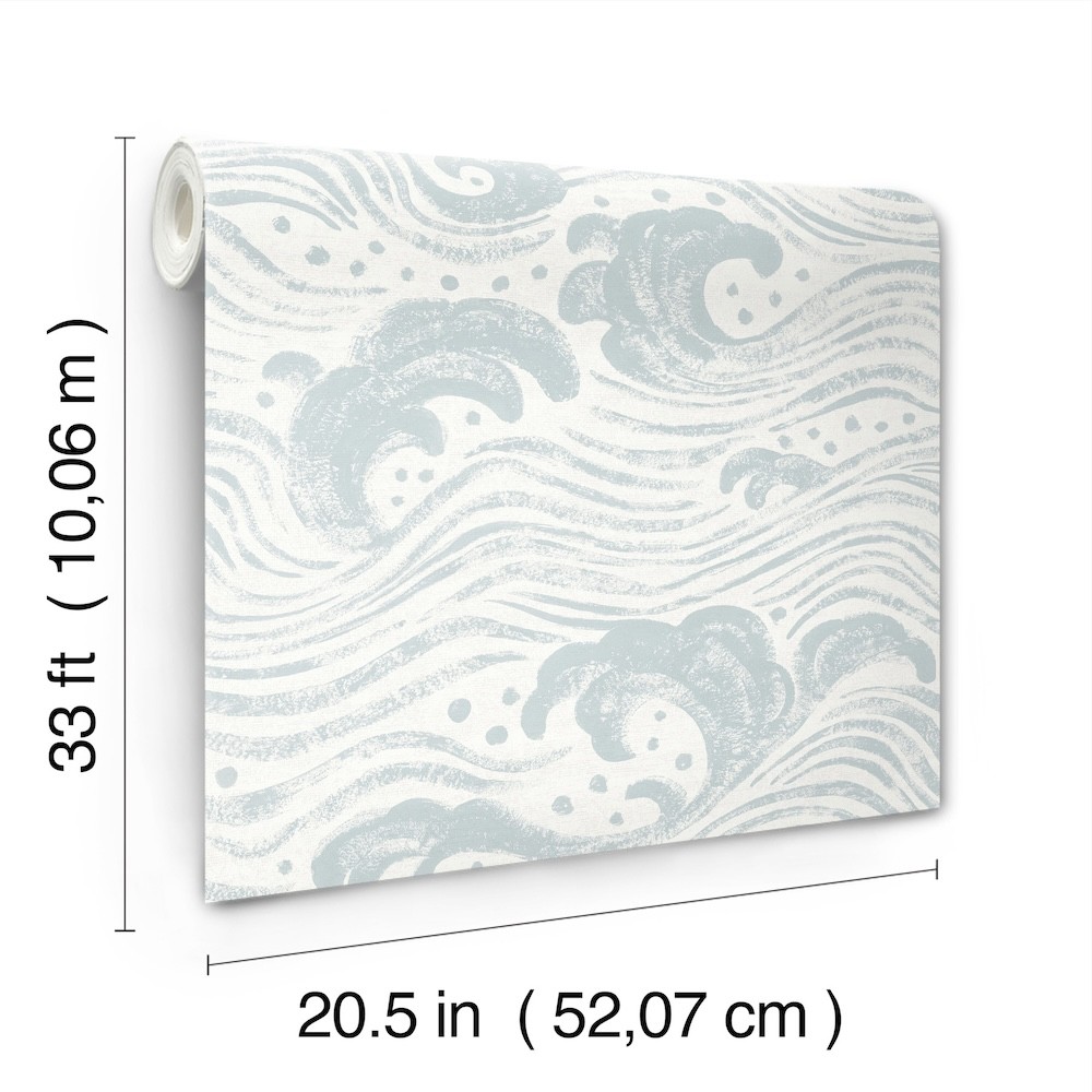 The powerful surge of the ocean is painted in a free-flowing, impressionistic style, featuring soft blue against white. Swell is an unpasted, non woven wallpaper measuring 20.5 inches wide by 33 feet long, covering approximately 56.4 square feet per roll.