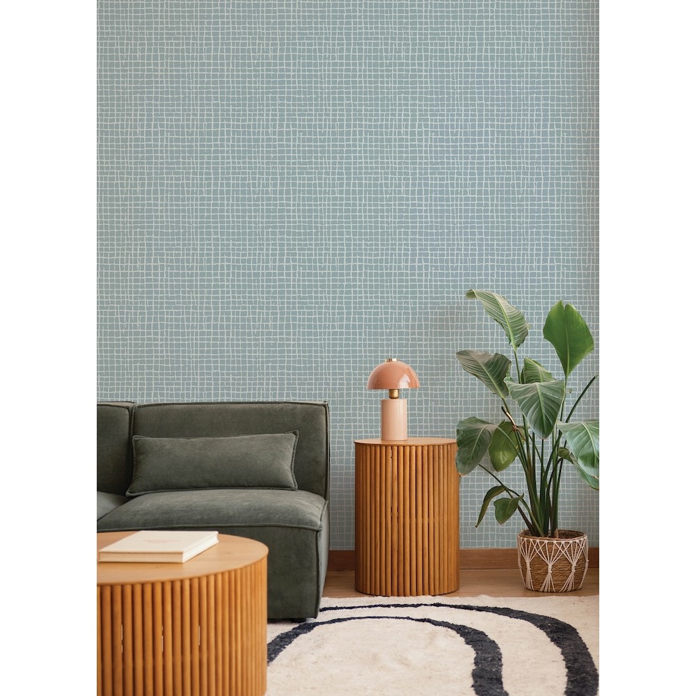 The hand-drawn netting of Albin offers modern dimension elevated by tactile detailing. Featured here with pale grey linework against robin's egg blue. Albin is an unpasted, non woven wallpaper measuring 20.5 inches wide by 33 feet long, covering approximately About 56.4 square feet square feet per roll.
