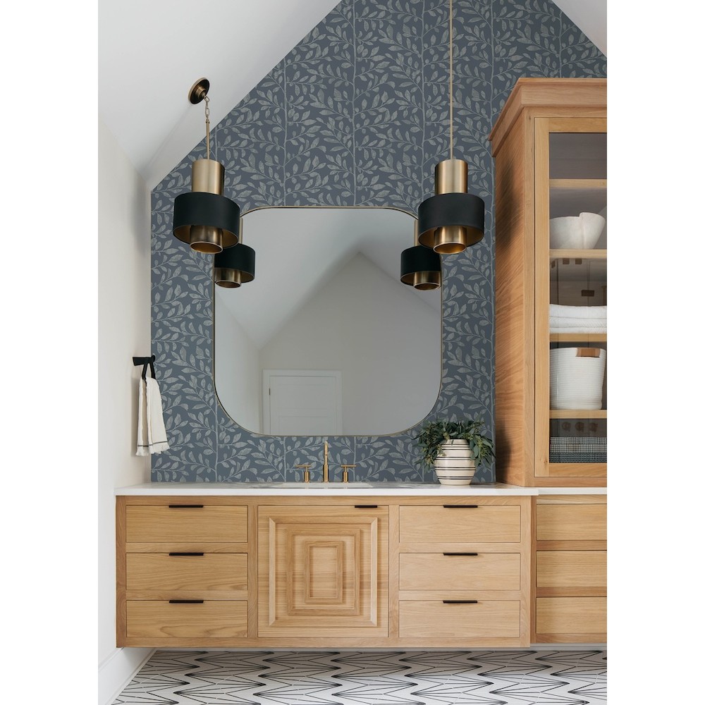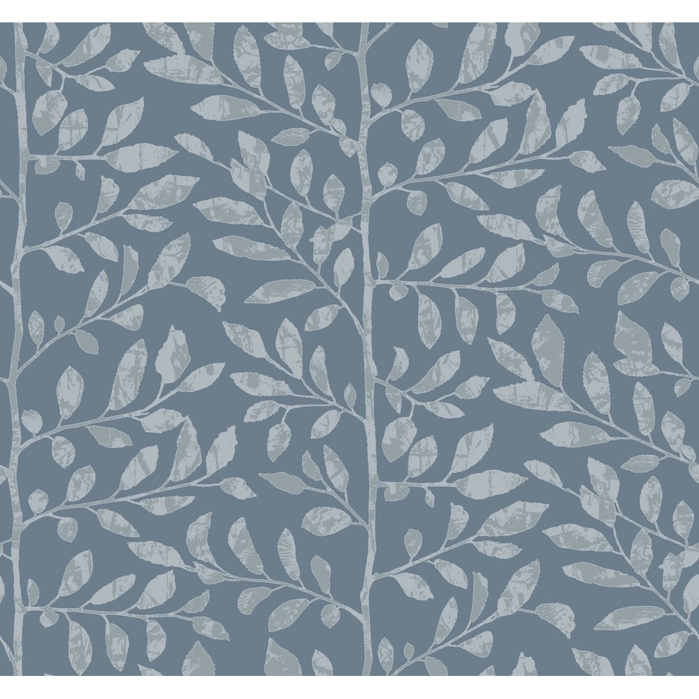 Offering both botanical charms and an organic alternative to stripes, Sagecrest features spindly saplings with thin branches laden with leaves. Seen here with metallic silver foliage against a dusty blue backdrop. Sagecrest is an unpasted, non woven wallpaper measuring 27 inches wide by 27 feet long, covering approximately About 60.8 square feet square feet per roll.