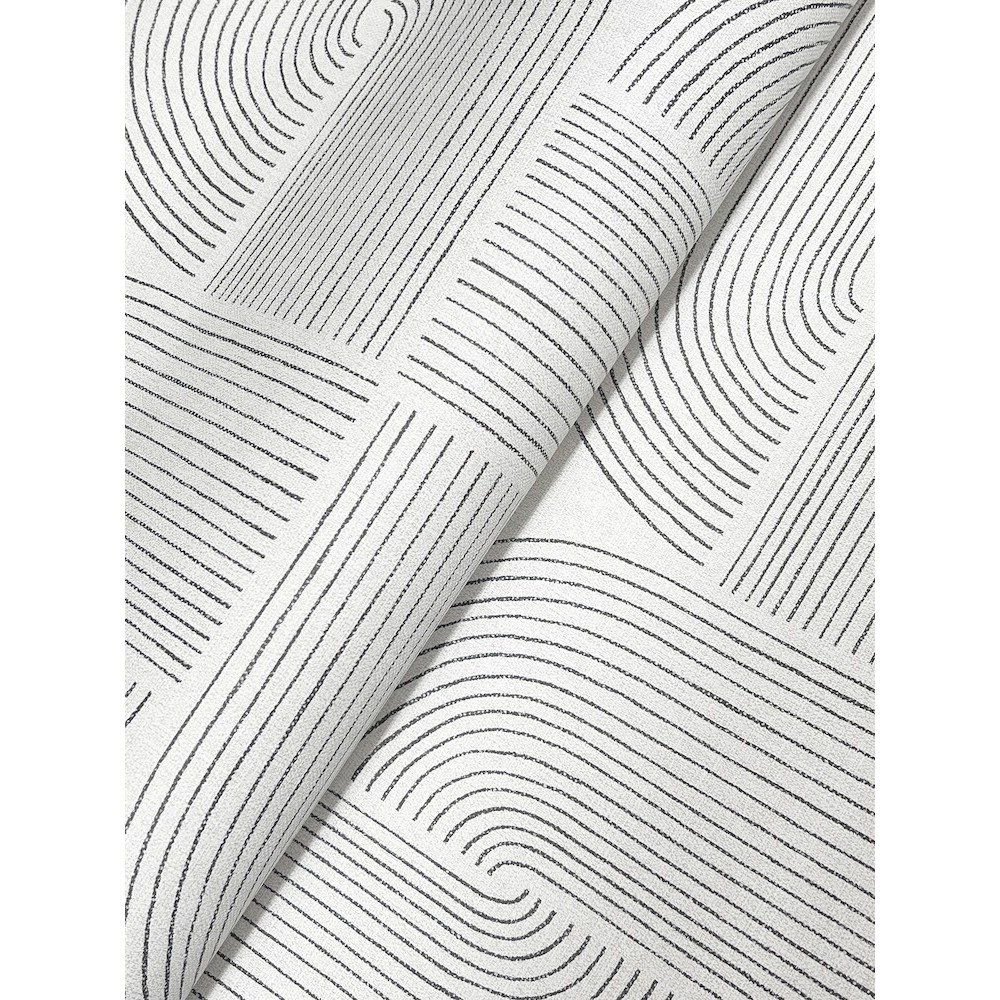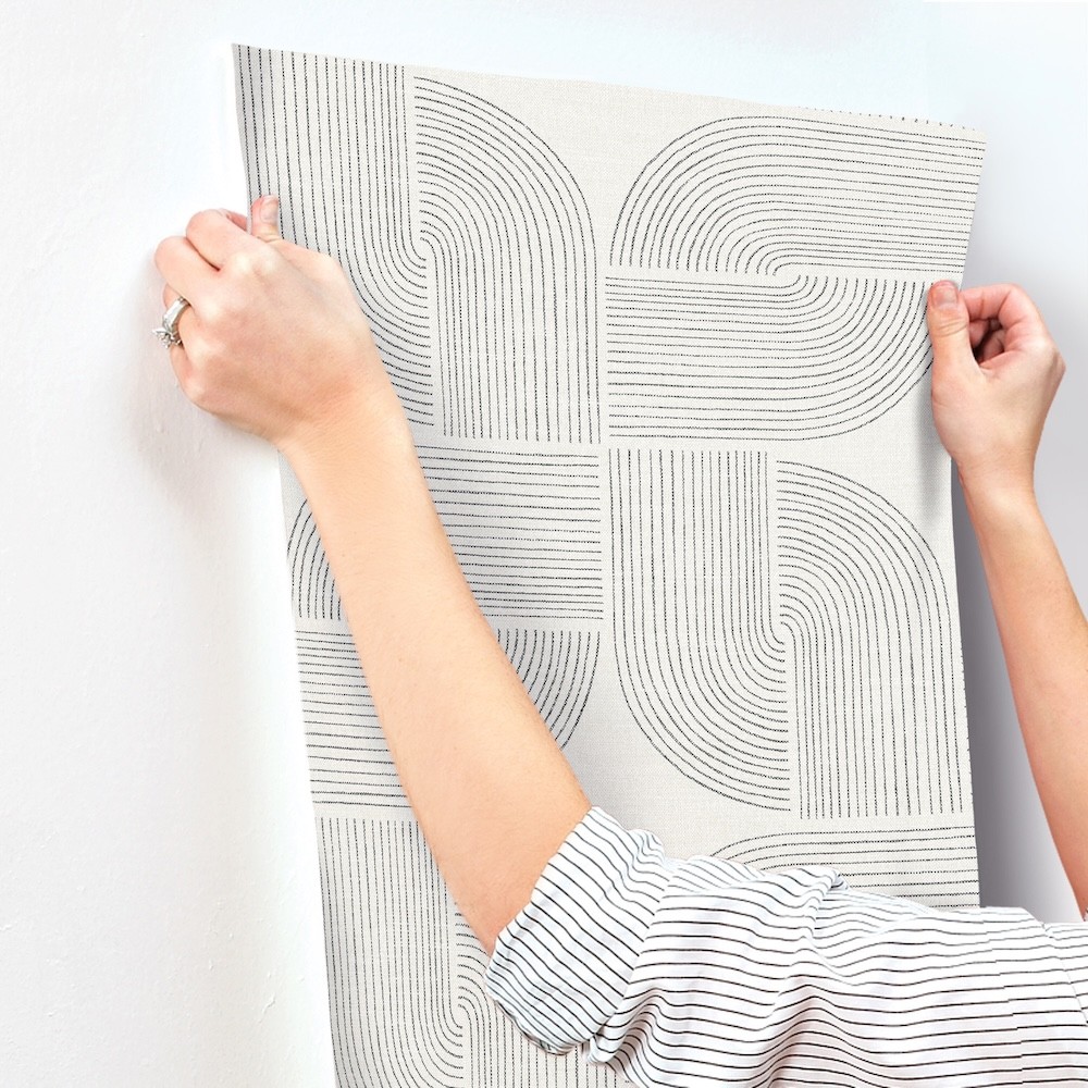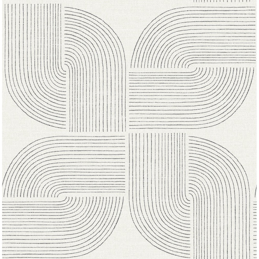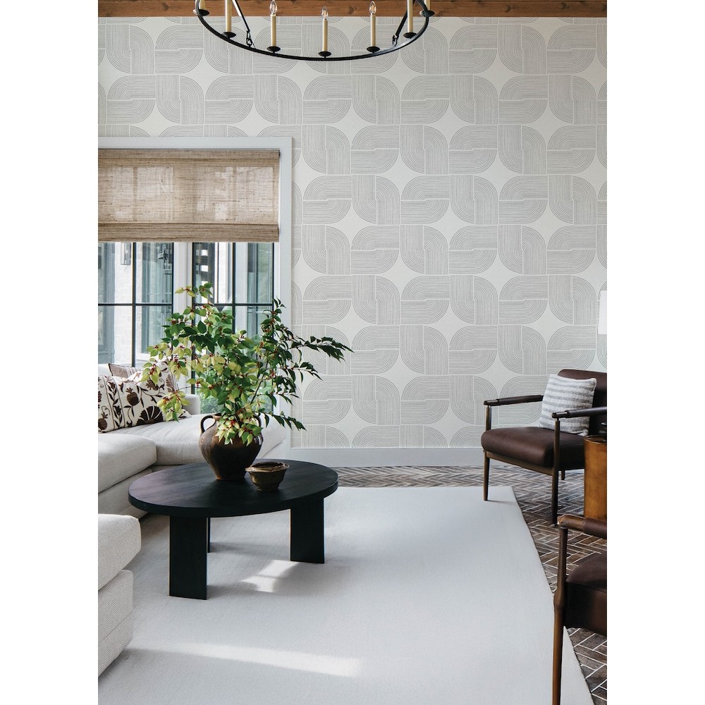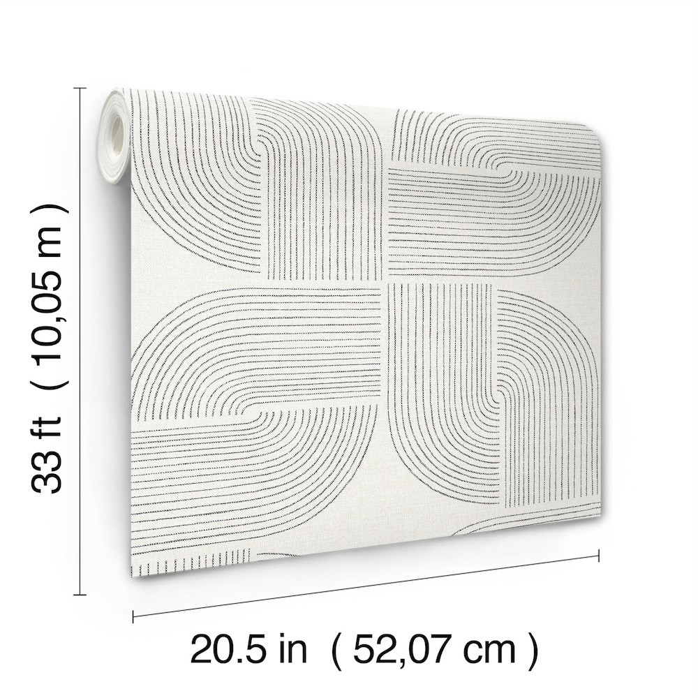 The culmination of linear arches and the stars formed at their center lends Savoye retro flair and lived-in elegance. Featured here with black linework against grey. Savoye is an unpasted, non woven wallpaper measuring 20.5 inches wide by 33 feet long, covering approximately About 56.4 square feet square feet per roll.