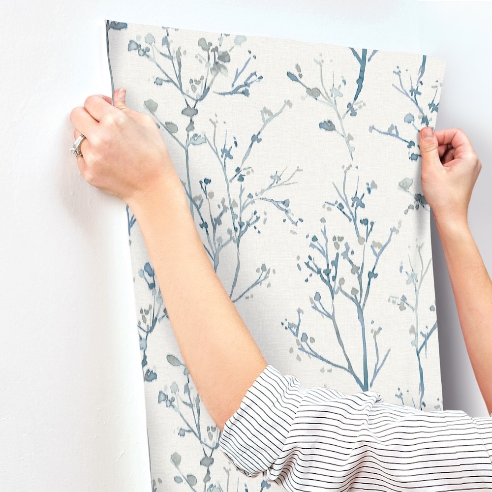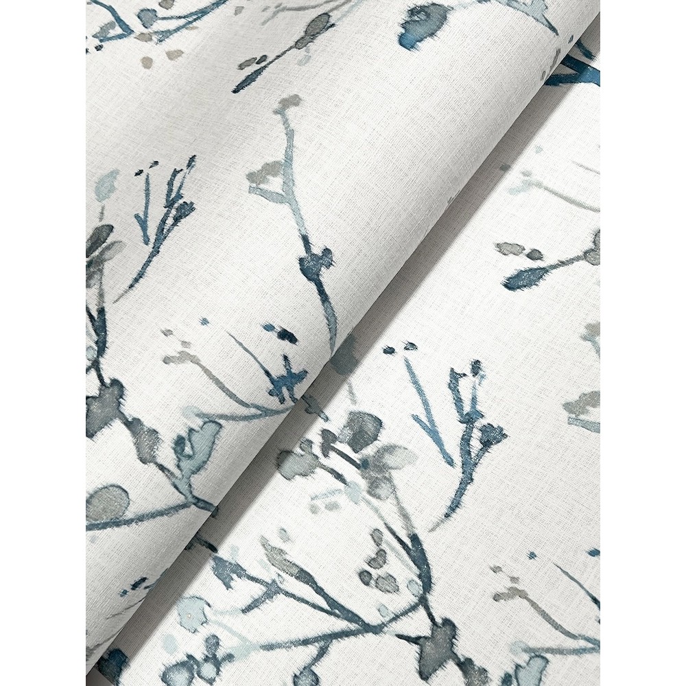 Silvering’s delicate, budding branches inked in soft watercolors are laid against a backdrop enriched with linen detailing. Seen here in shades of blue and grey against cream. Silverling is an unpasted, non woven wallpaper measuring 20.5 inches wide by 33 feet long, covering approximately About 56.4 square feet square feet per roll.