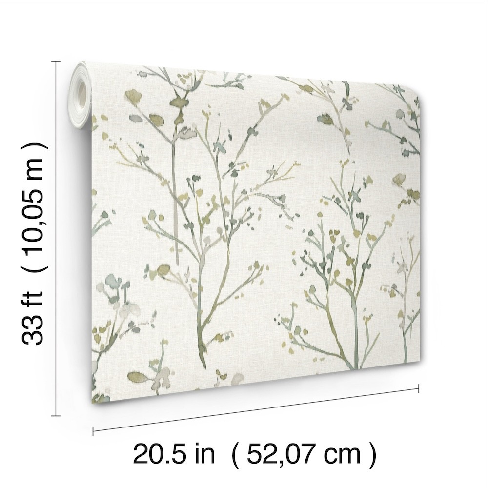 Silvering’s delicate, budding branches inked in soft watercolors are laid against a backdrop enriched with linen detailing. Seen here in shades of green, teal, and grey against cream. Silverling is an unpasted, non woven wallpaper measuring 20.5 inches wide by 33 feet long, covering approximately About 56.4 square feet square feet per roll.