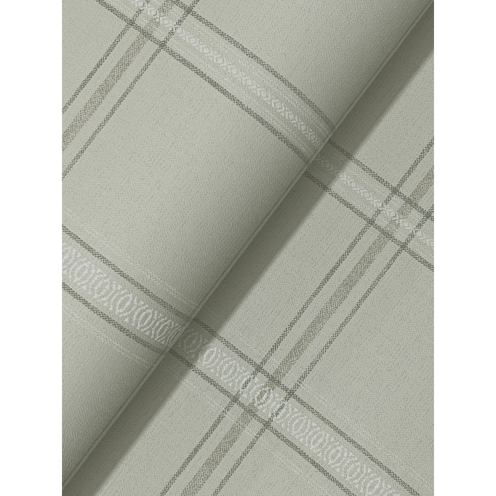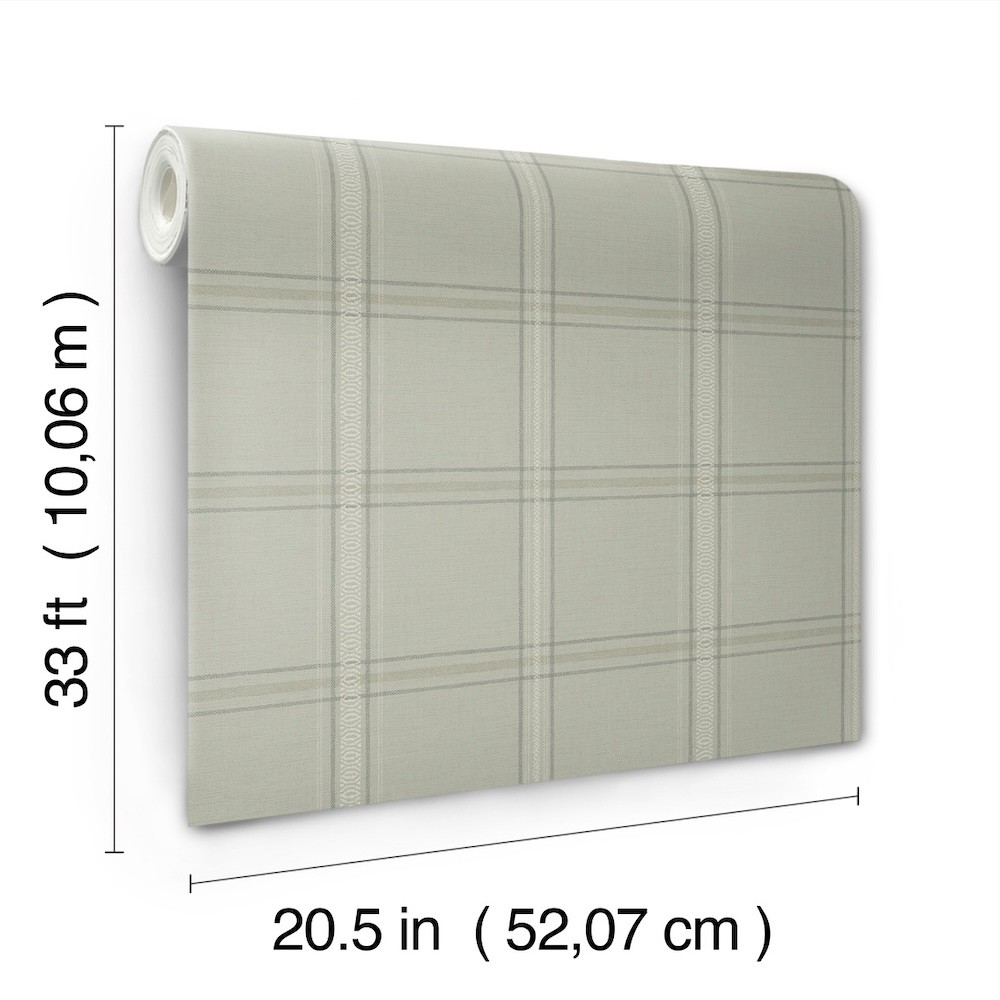 This embellished windowpane plaid wallpaper features vertical columns that alternate between narrow and wide diamond pattern detailing. Featured here in sage accented by moss, forest green, and white. Auberge is an unpasted, non woven wallpaper measuring 20.5 inches wide by 33 feet long, covering approximately 56.4 square feet per roll.